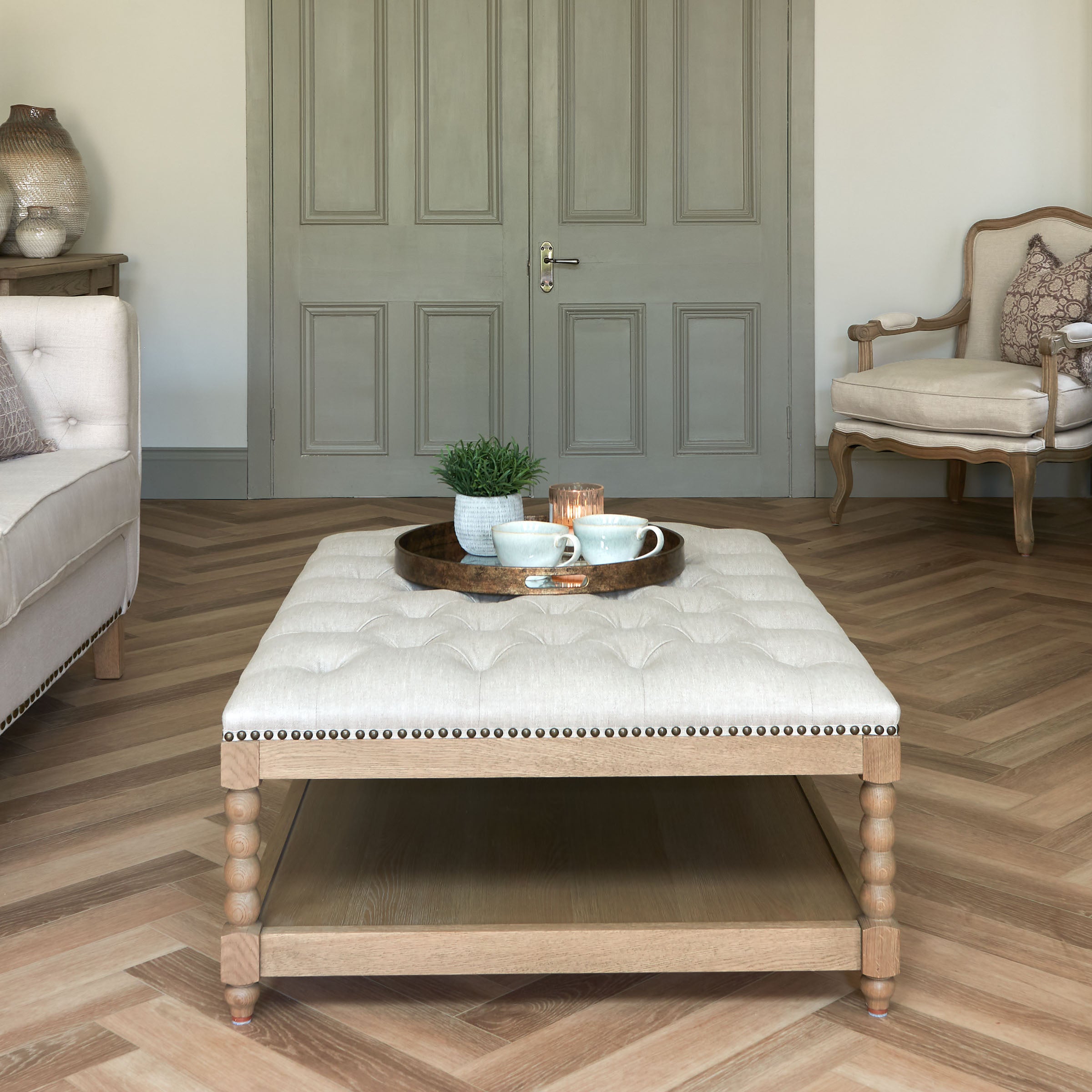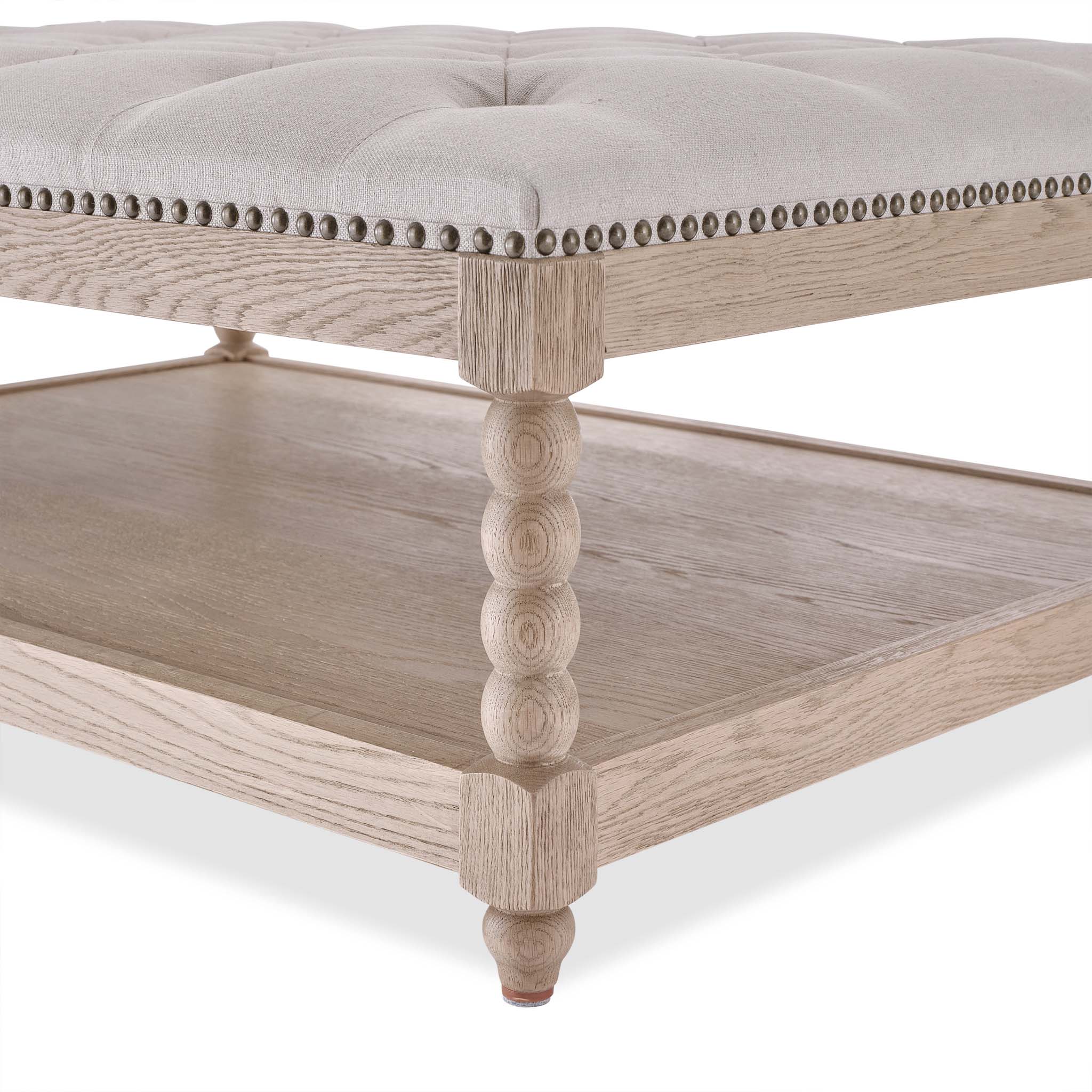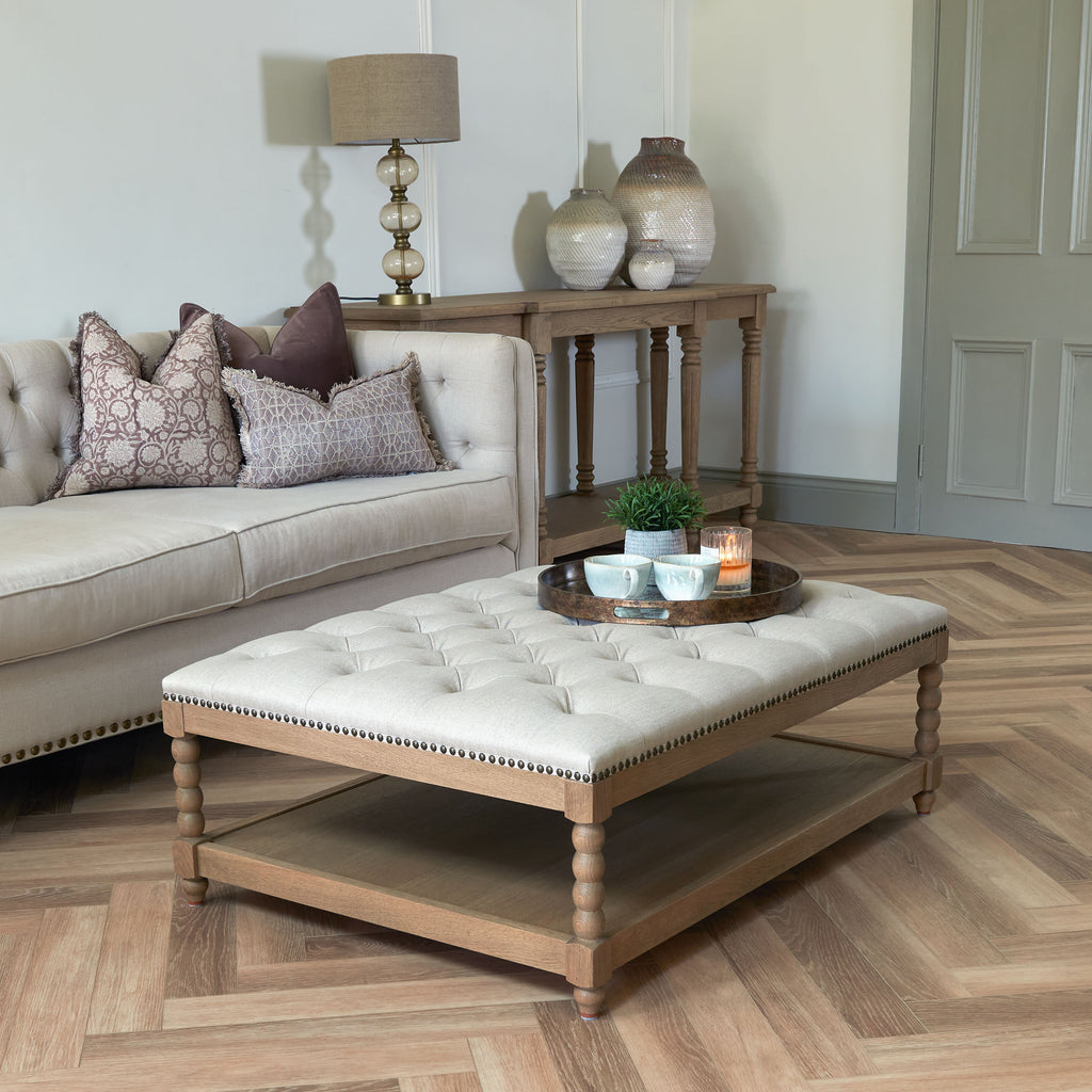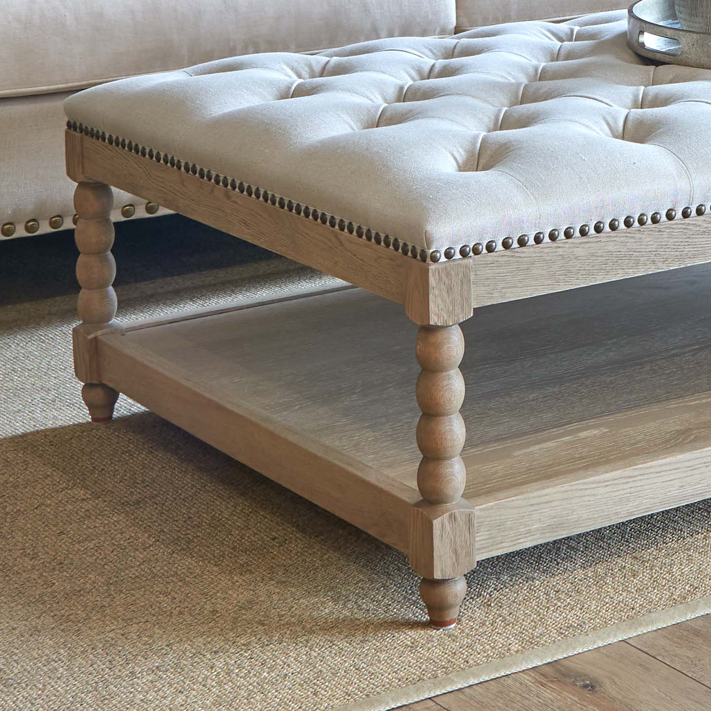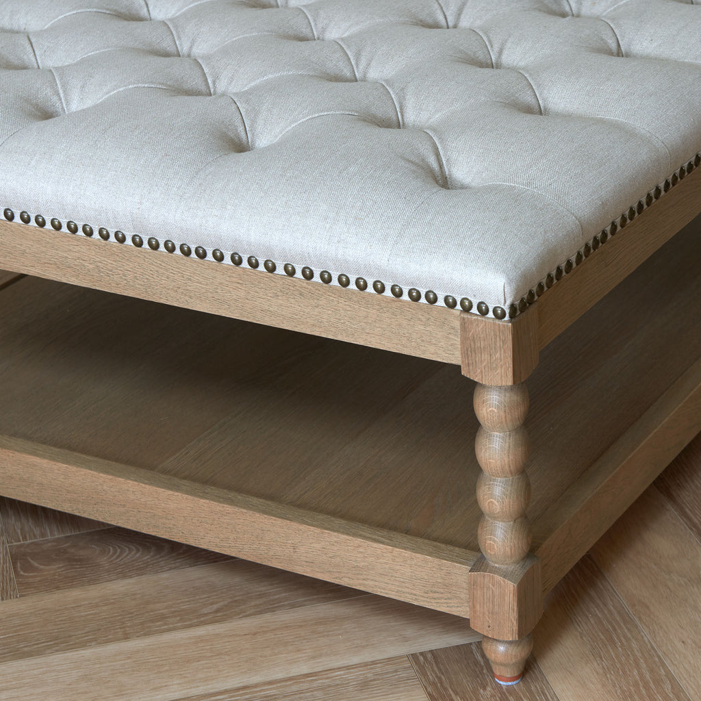 Upholstered in a luxurious 100% soft oatmeal Belgian linen, the Cleveland ottoman is handcrafted with a solid, sturdy, and weighty weathered oak frame. It has been lightly wire-brushed to enhance the grain of the wood, giving it a more pronounced appearance and highlighting the unique texture of the oak. This ottoman features a sumptuous deep-buttoned, hand-upholstered top with brass studded detailing around the edge, adding to the attention to detail. Decorative solid oak bobbin legs add a touch of classic craftsmanship to its refined style. It can be used as a coffee table, footstool, or extra seating and it features a handy shelf underneath for extra storage. Handcrafted from solid oak and finished with our signature multi-staged weathered oak finish, it highlights the wood’s natural warmth and character. This piece also beautifully complements all our other exclusive furniture collections. The Cleveland ottoman will add a truly stylish look to any sitting room.