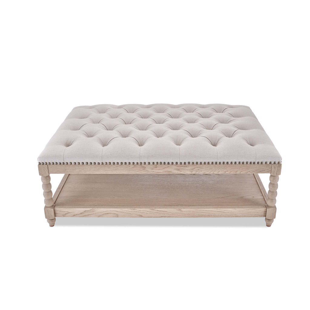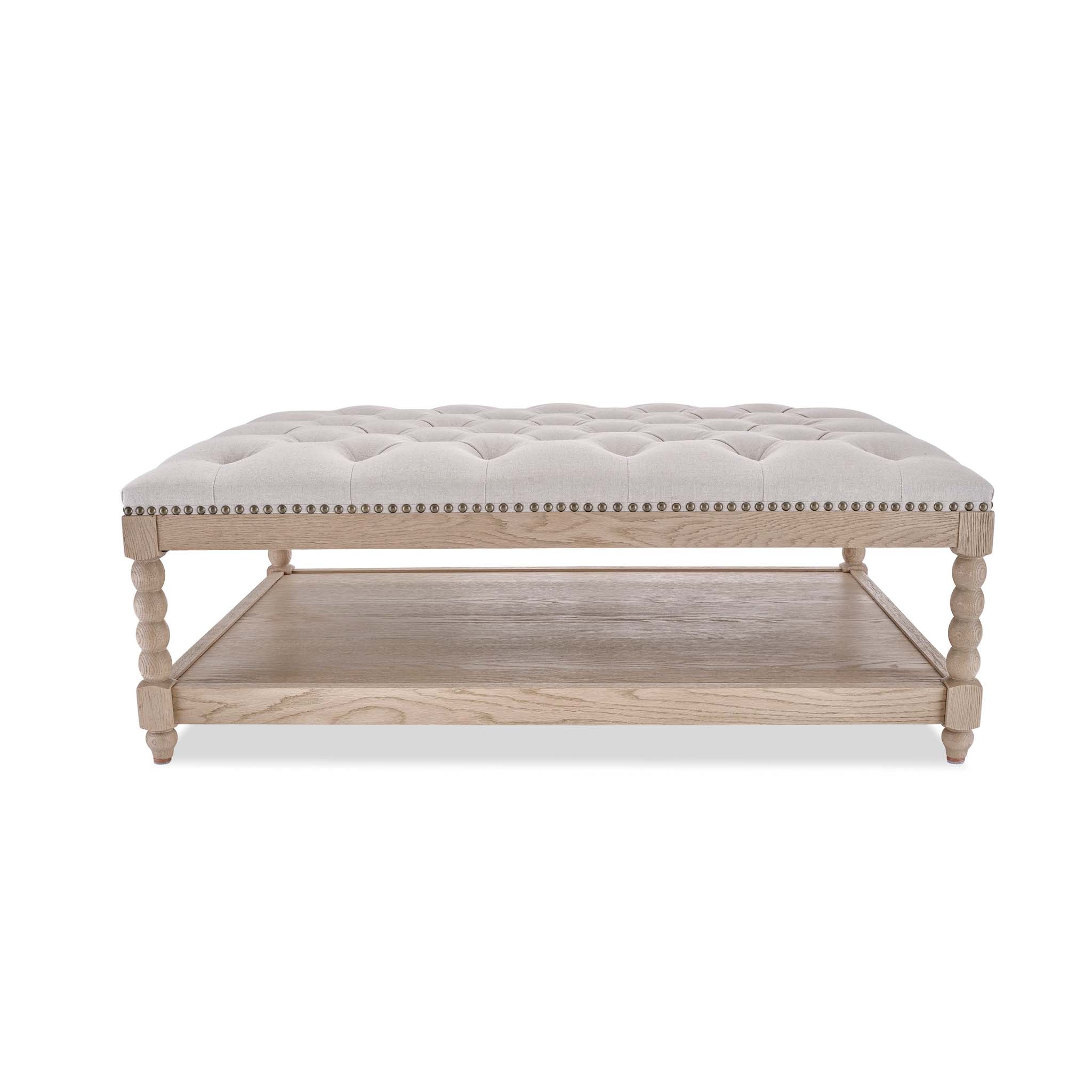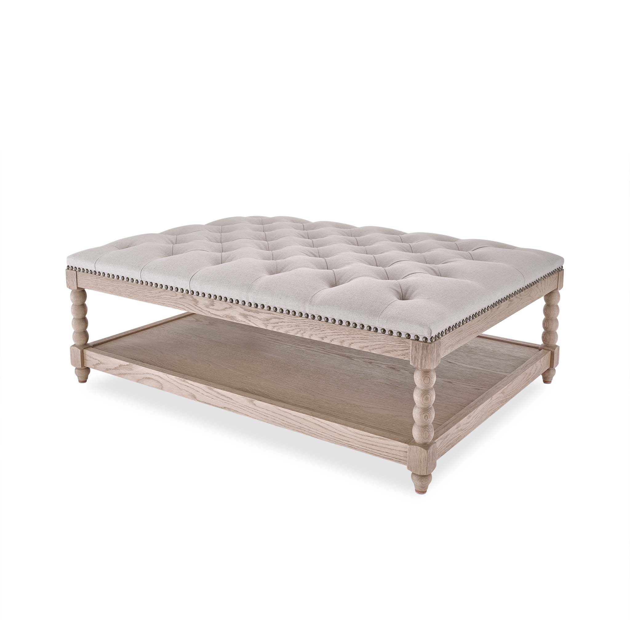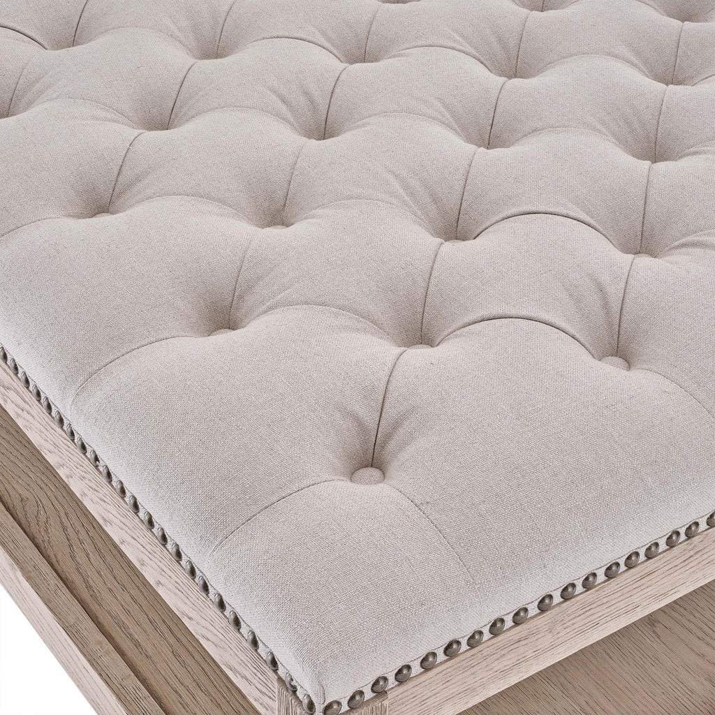 Upholstered in a luxurious 100% soft oatmeal Belgian linen, the Cleveland ottoman is handcrafted with a solid, sturdy, and weighty weathered oak frame. It has been lightly wire-brushed to enhance the grain of the wood, giving it a more pronounced appearance and highlighting the unique texture of the oak. This ottoman features a sumptuous deep-buttoned, hand-upholstered top with brass studded detailing around the edge, adding to the attention to detail. Decorative solid oak bobbin legs add a touch of classic craftsmanship to its refined style. It can be used as a coffee table, footstool, or extra seating and it features a handy shelf underneath for extra storage. Handcrafted from solid oak and finished with our signature multi-staged weathered oak finish, it highlights the wood’s natural warmth and character. This piece also beautifully complements all our other exclusive furniture collections. The Cleveland ottoman will add a truly stylish look to any sitting room.