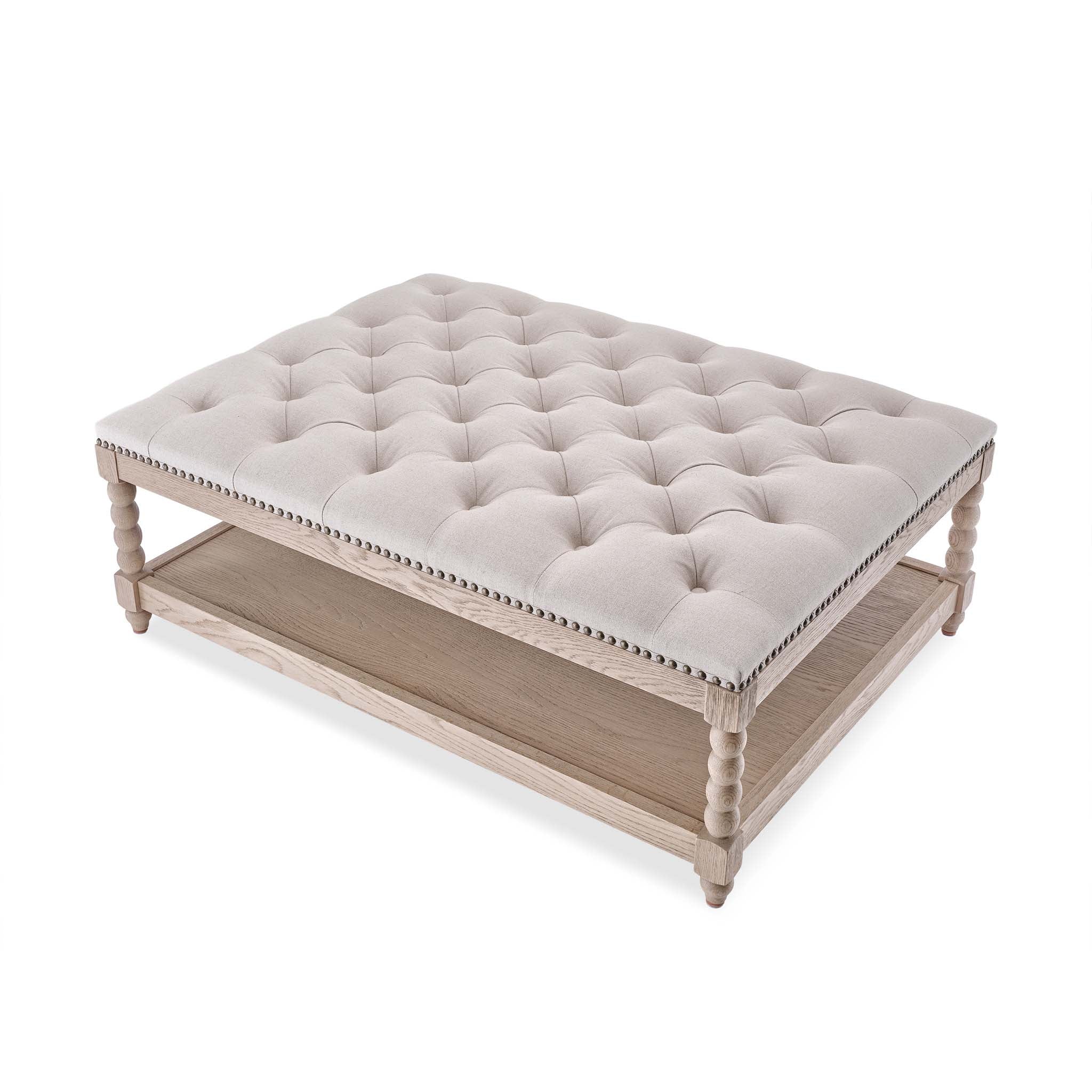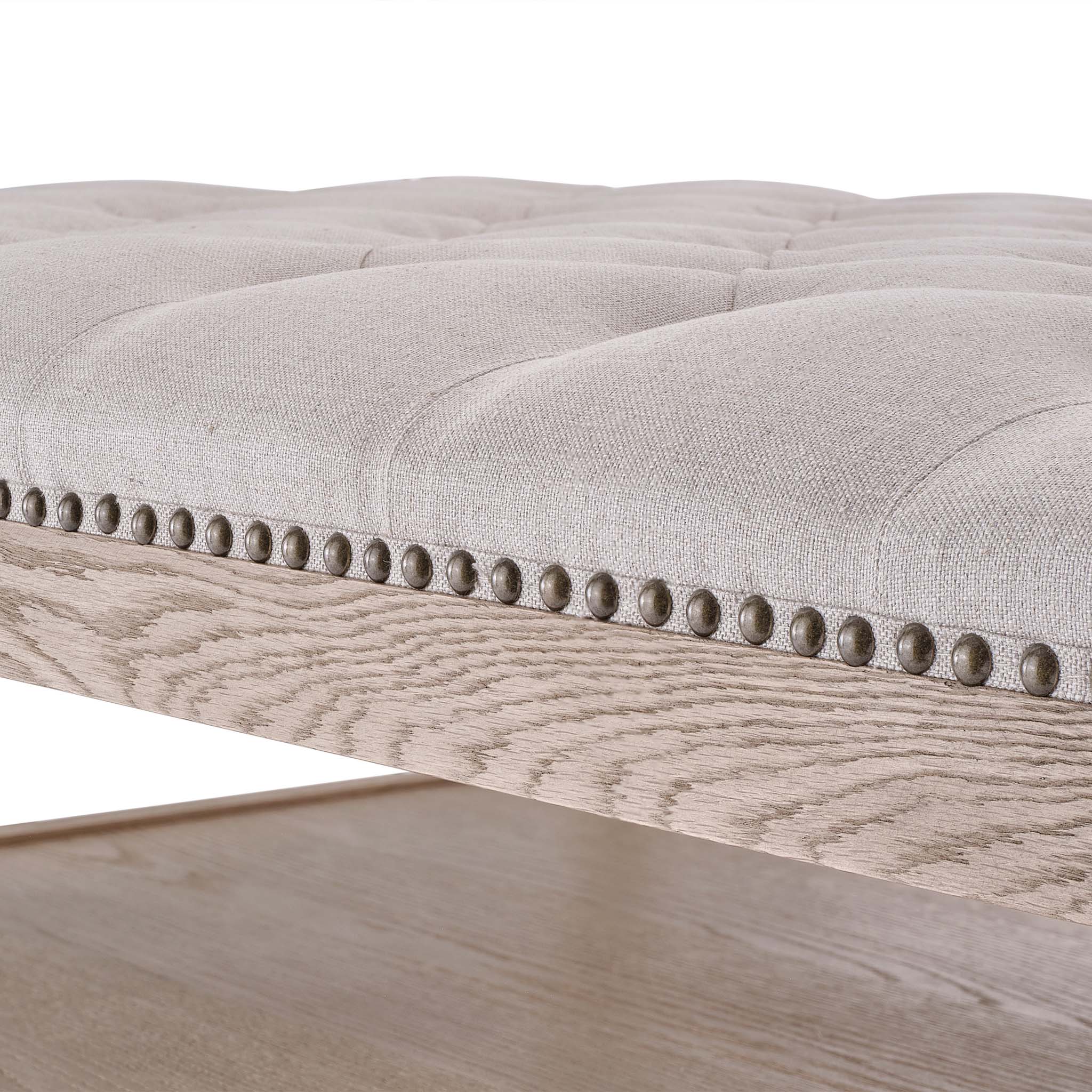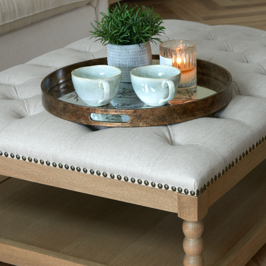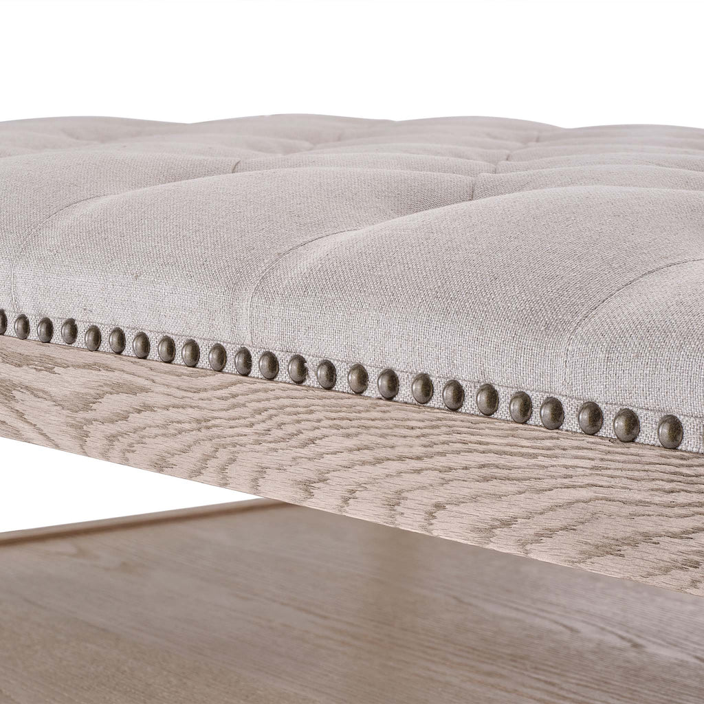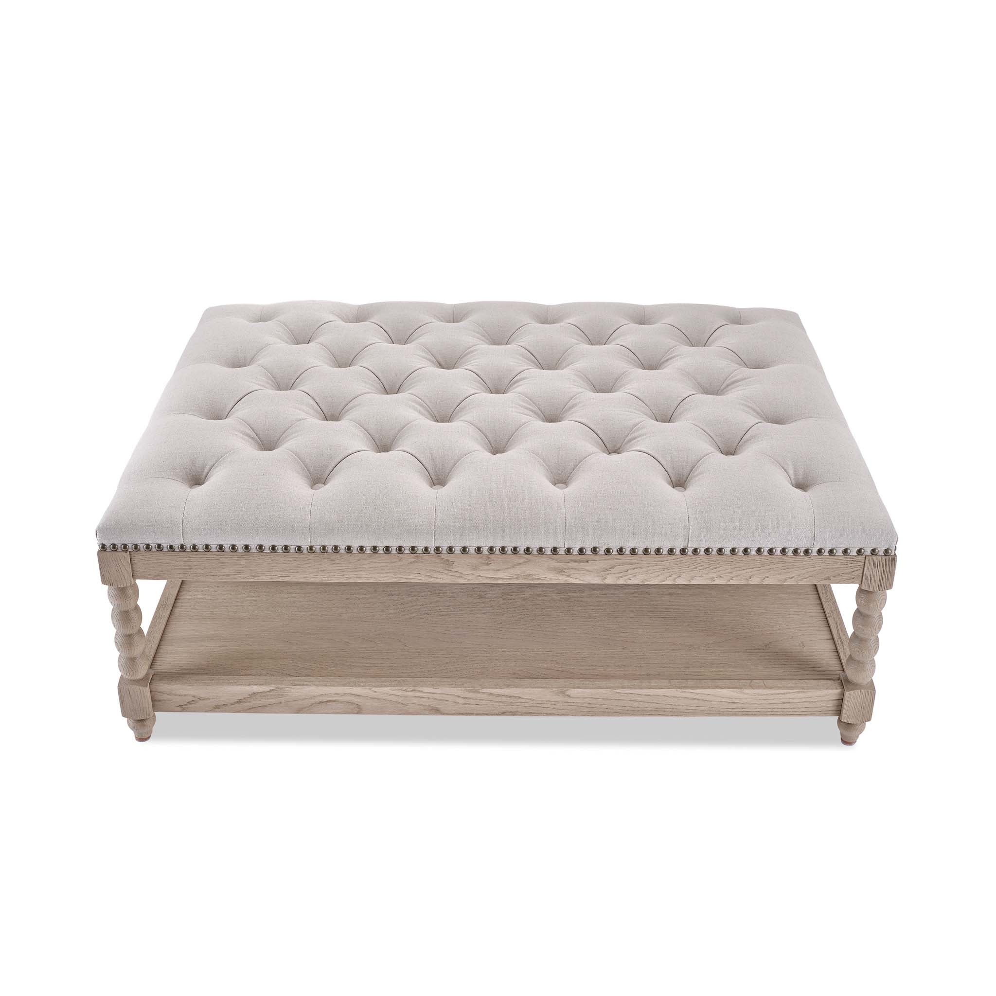 Upholstered in a luxurious 100% soft oatmeal Belgian linen, the Cleveland ottoman is handcrafted with a solid, sturdy, and weighty weathered oak frame. It has been lightly wire-brushed to enhance the grain of the wood, giving it a more pronounced appearance and highlighting the unique texture of the oak. This ottoman features a sumptuous deep-buttoned, hand-upholstered top with brass studded detailing around the edge, adding to the attention to detail. Decorative solid oak bobbin legs add a touch of classic craftsmanship to its refined style. It can be used as a coffee table, footstool, or extra seating and it features a handy shelf underneath for extra storage. Handcrafted from solid oak and finished with our signature multi-staged weathered oak finish, it highlights the wood’s natural warmth and character. This piece also beautifully complements all our other exclusive furniture collections. The Cleveland ottoman will add a truly stylish look to any sitting room.