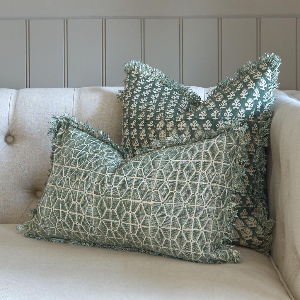 This rectangular cushion features a bold geometric block print in fresh green tones on soft cotton. Its compact size and eye-catching pattern make it ideal for layering with other cushions for a stylish and thoughtful look. Please note, due to the handcrafted nature of these cushions, slight variations in pattern may occur and are part of their unique character and charm.