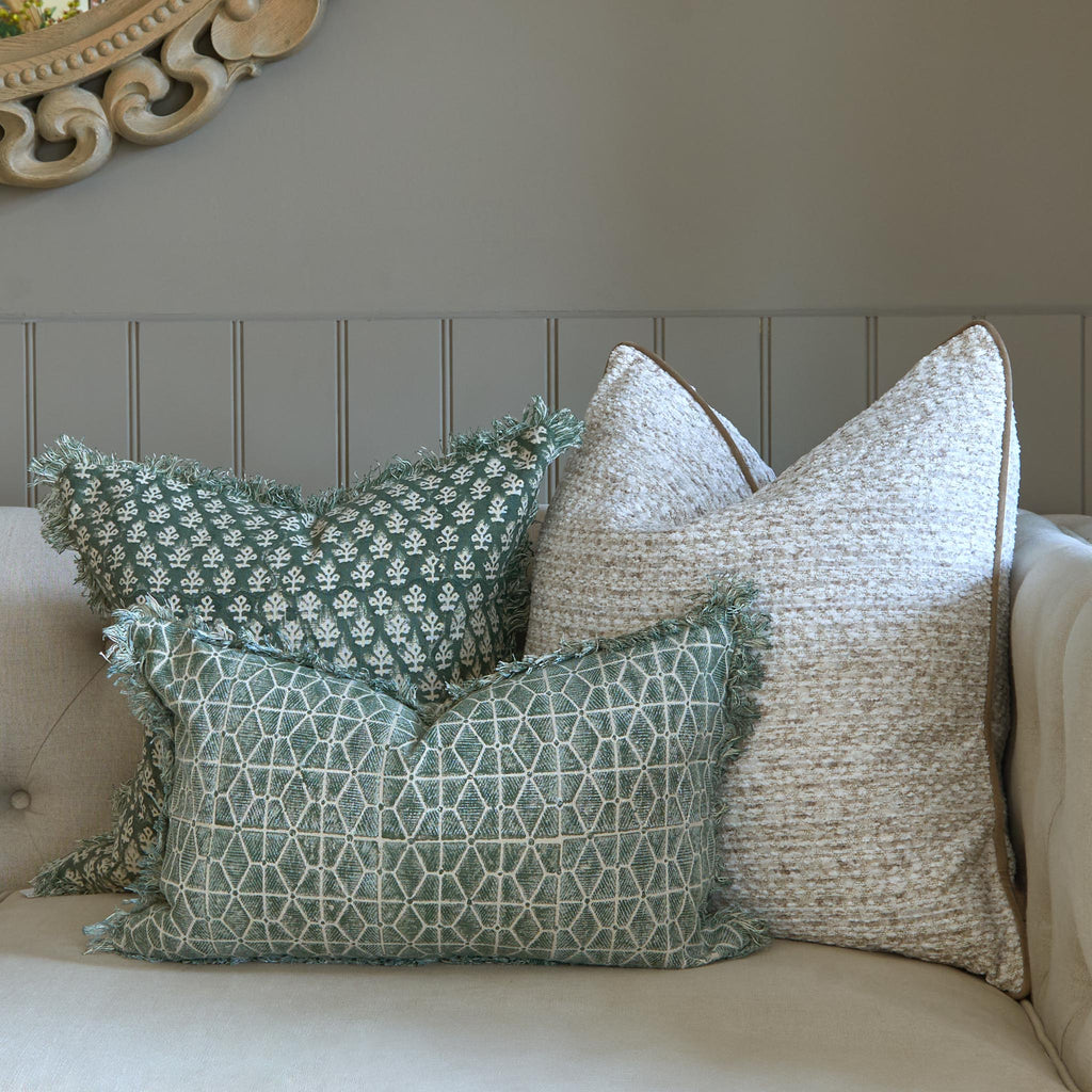 Featuring a traditional Bhuti block print on a soft green cotton base, this cushion brings a hint of pattern in natural tones and soft green to your space. A simple way to refresh a sofa, chair, or bed with a natural, relaxed feel. Please note, due to the handcrafted nature of these cushions, slight variations in pattern may occur and are part of their unique character and charm.