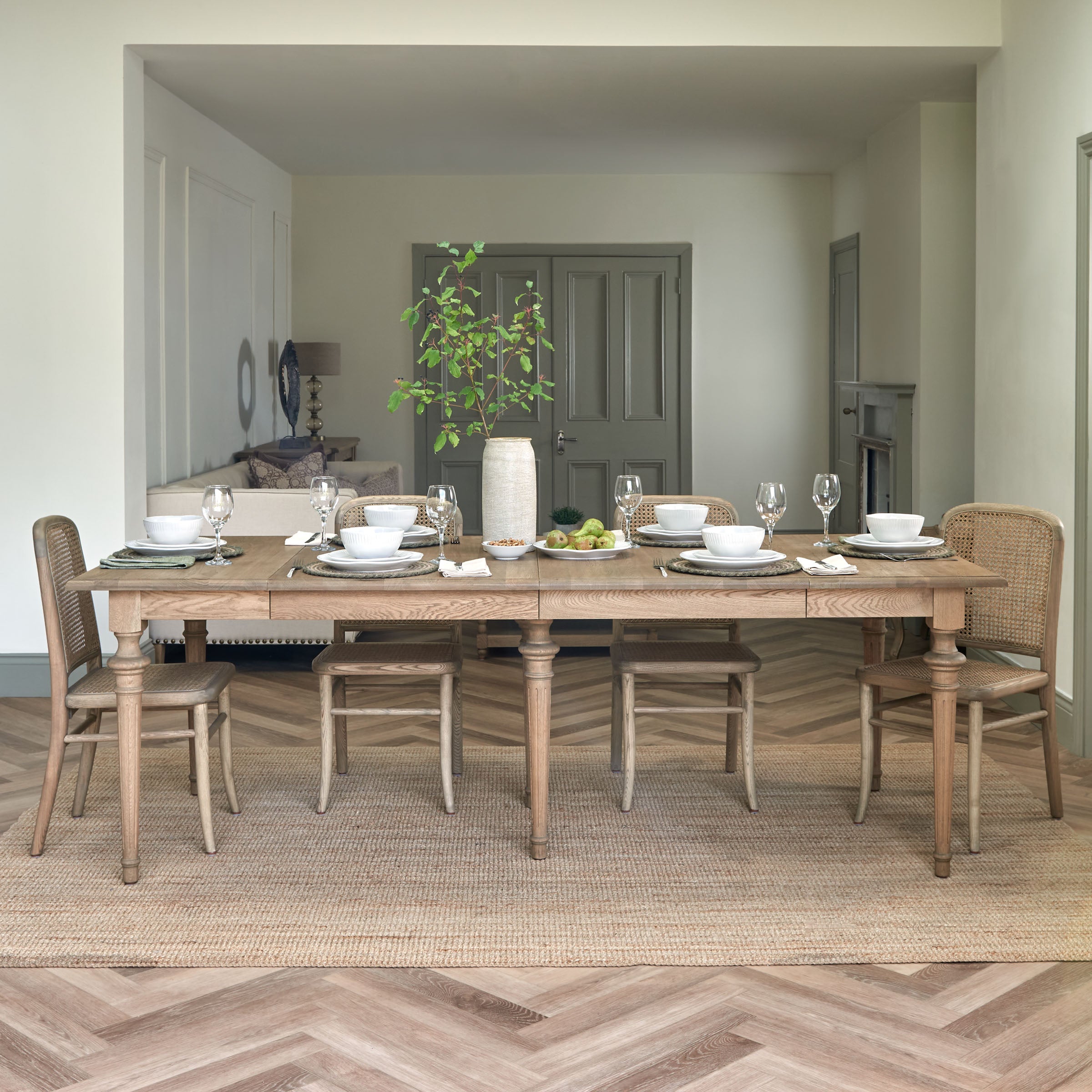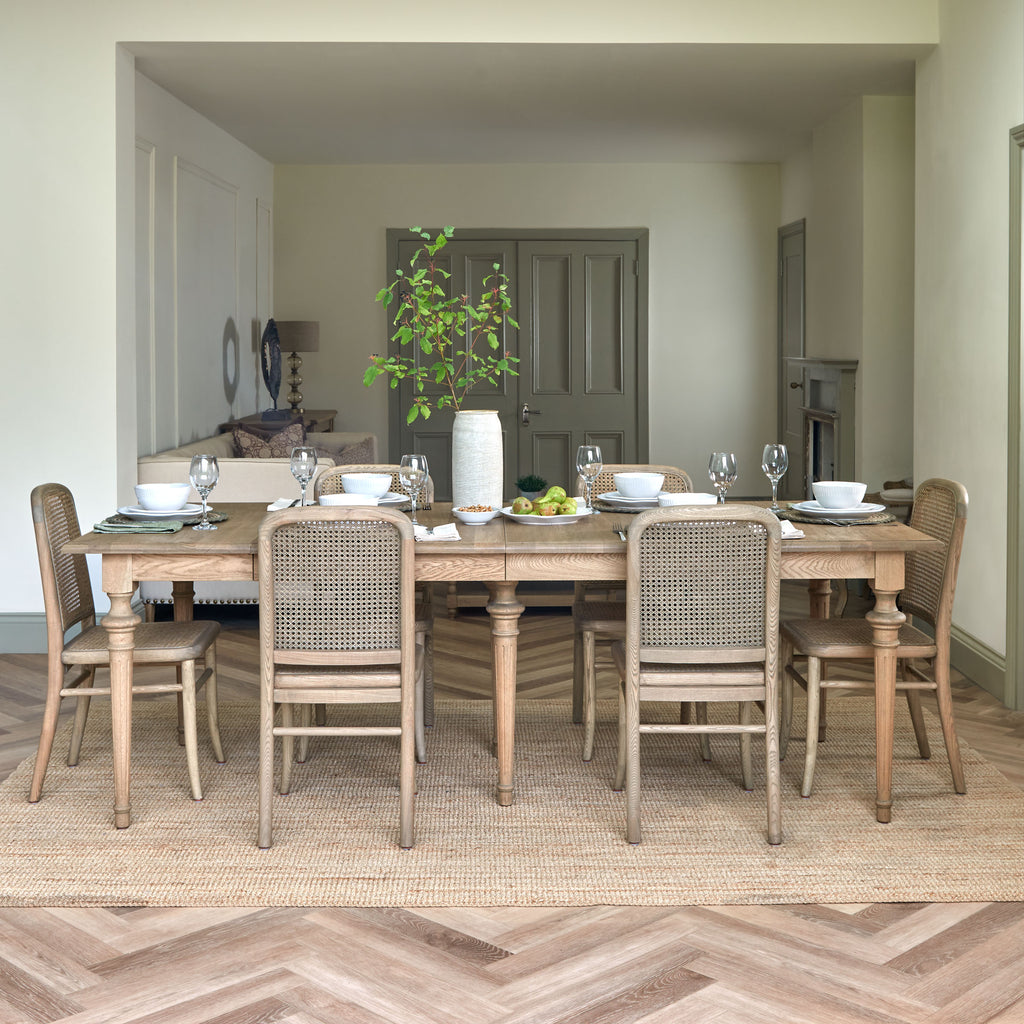 The Burlington dining chair is handcrafted with a solid, sturdy, and weighty hardwood frame and features a classic rattan weave across the seat and back for natural comfort and support. Inspired by traditional Parisian café chairs, its elegant silhouette offers a timeless addition to any dining space. The solid oak frame is hand-finished in our signature weathered oak to complement all of our other exclusive dining table collections.