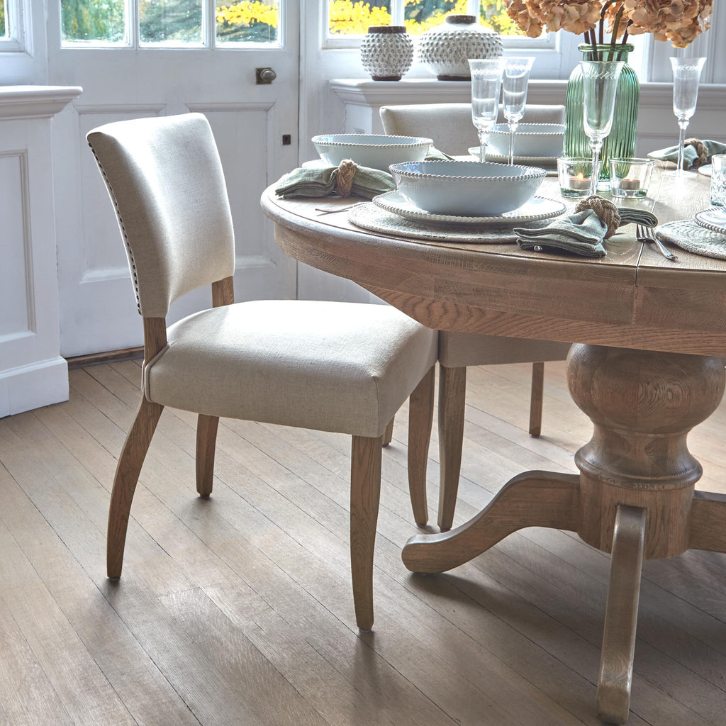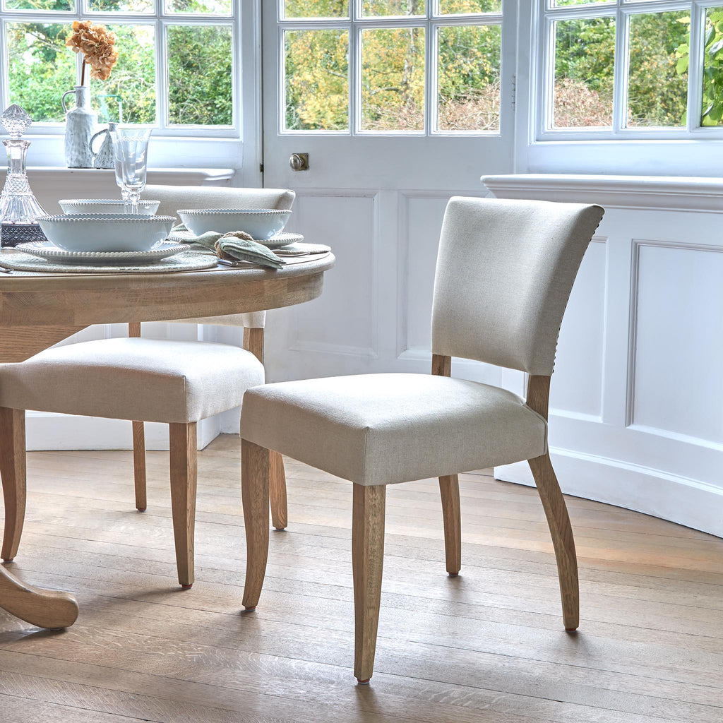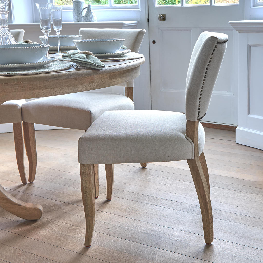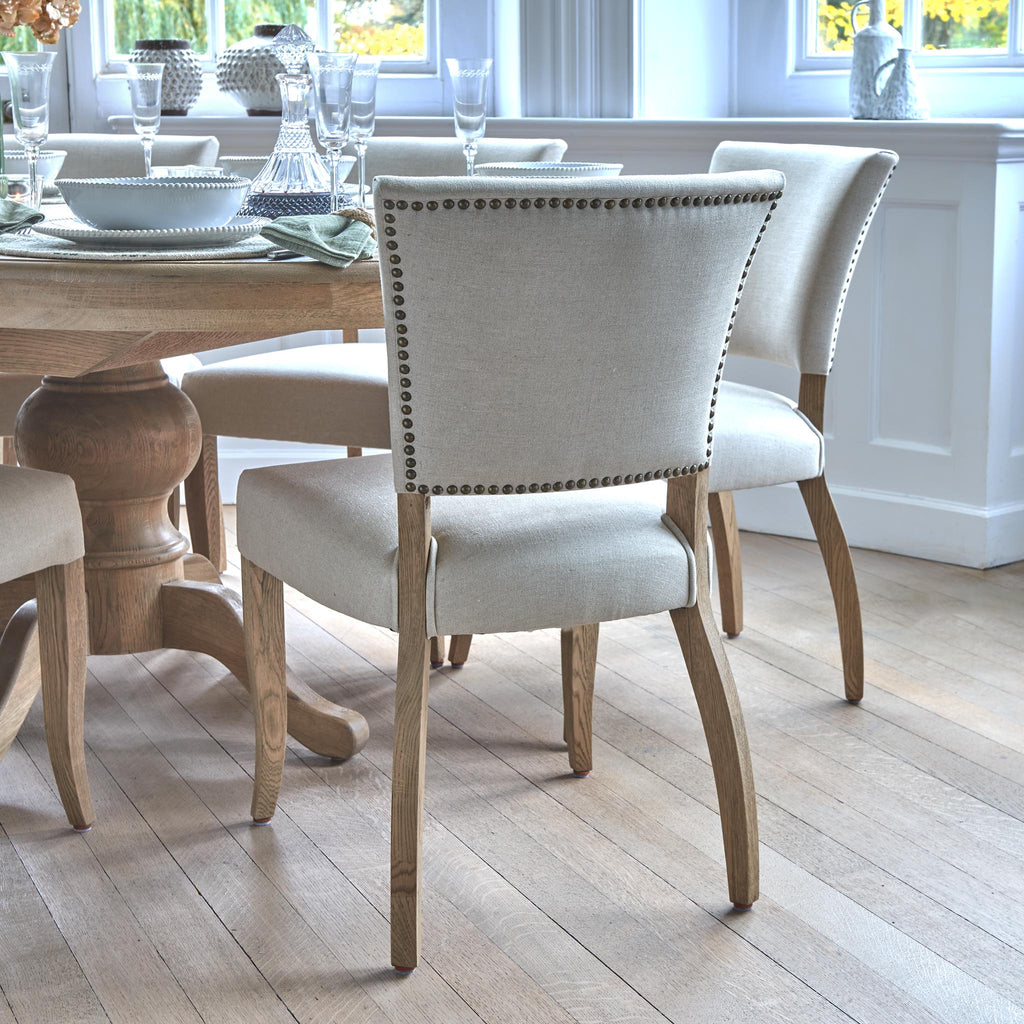 The Cavendish dining chair is handcrafted with a solid, sturdy, and weighty hardwood frame and upholstered in 100% soft oatmeal Belgian linen. It features a smooth, gently curved back and a seat filled with high-density, comfortable foam to provide lasting comfort while enjoying memorable meals with friends and family. Elegant brass stud detailing runs along the edges which adds a refined finishing touch. The solid oak legs are hand-finished in our signature weathered oak to complement all our other exclusive dining table collections.