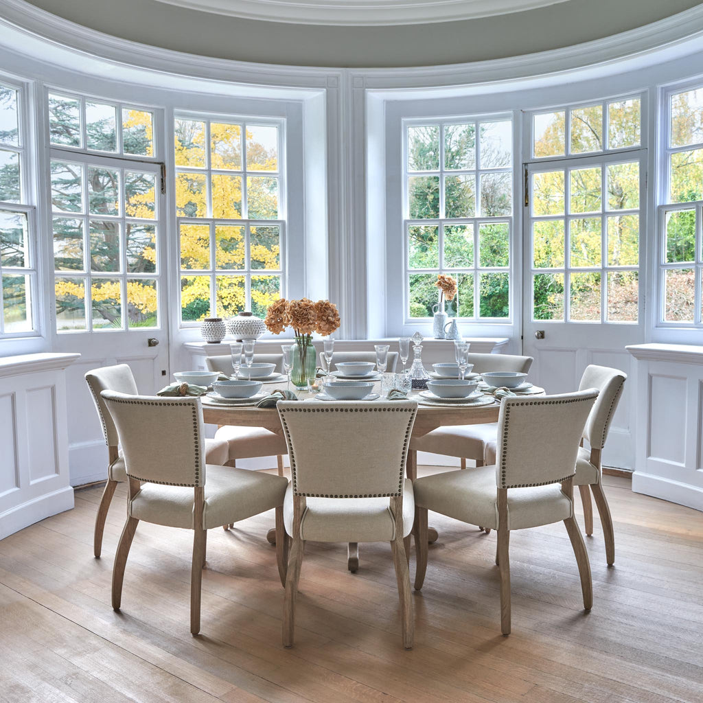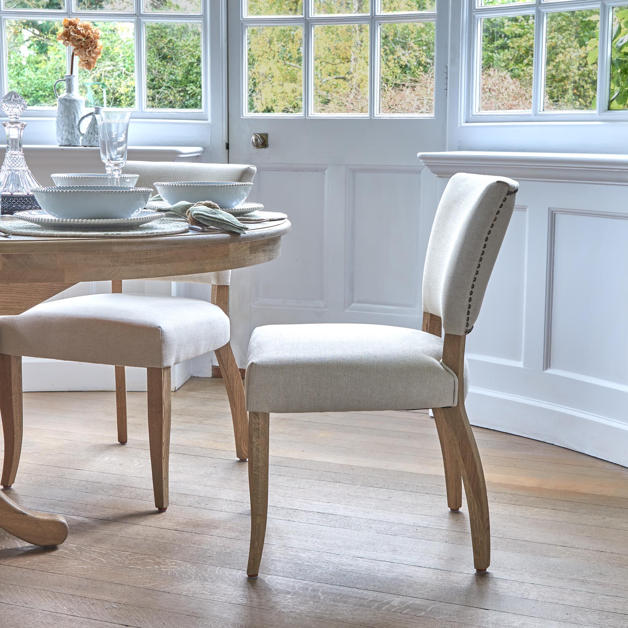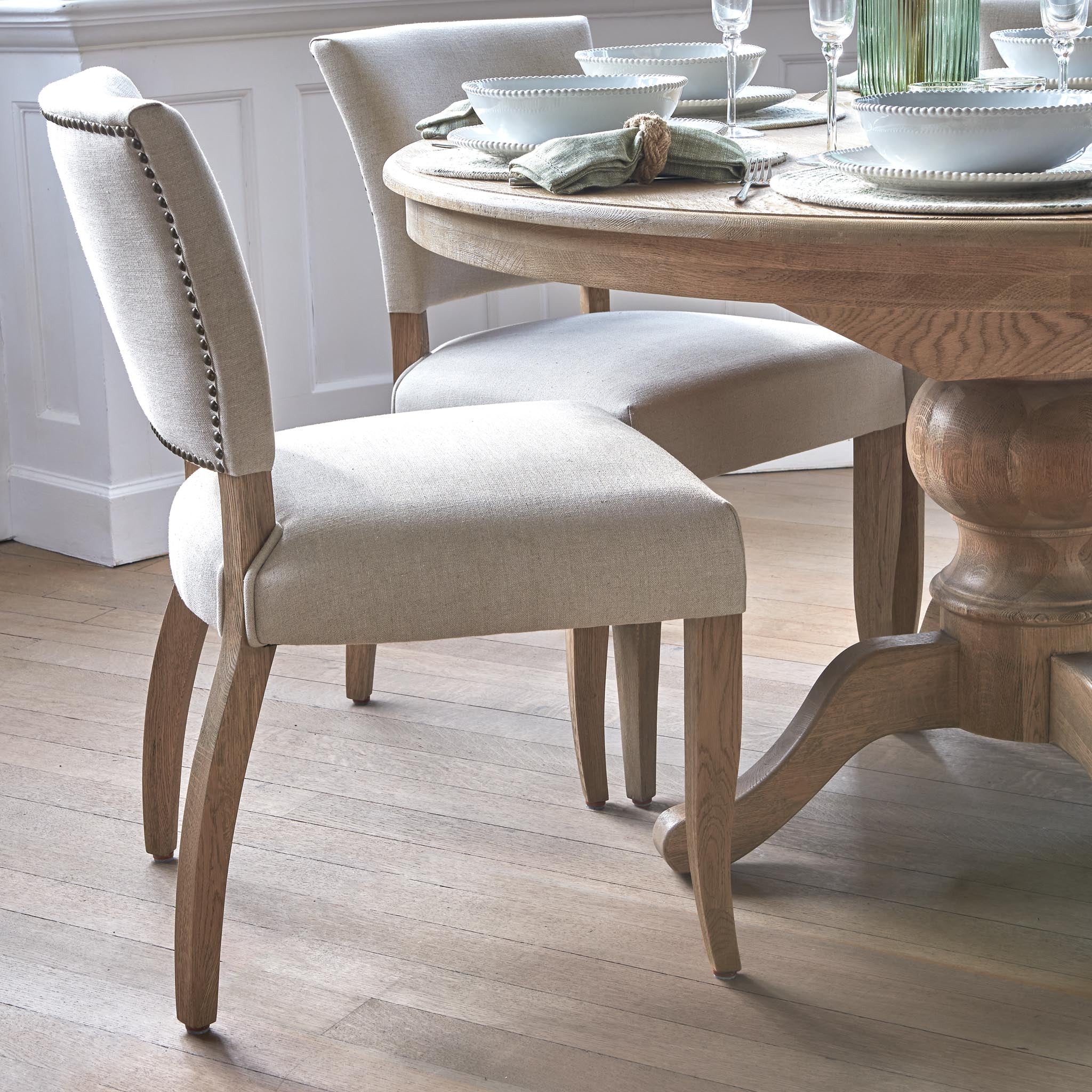 The Cavendish dining chair is handcrafted with a solid, sturdy, and weighty hardwood frame and upholstered in 100% soft oatmeal Belgian linen. It features a smooth, gently curved back and a seat filled with high-density, comfortable foam to provide lasting comfort while enjoying memorable meals with friends and family. Elegant brass stud detailing runs along the edges which adds a refined finishing touch. The solid oak legs are hand-finished in our signature weathered oak to complement all our other exclusive dining table collections.