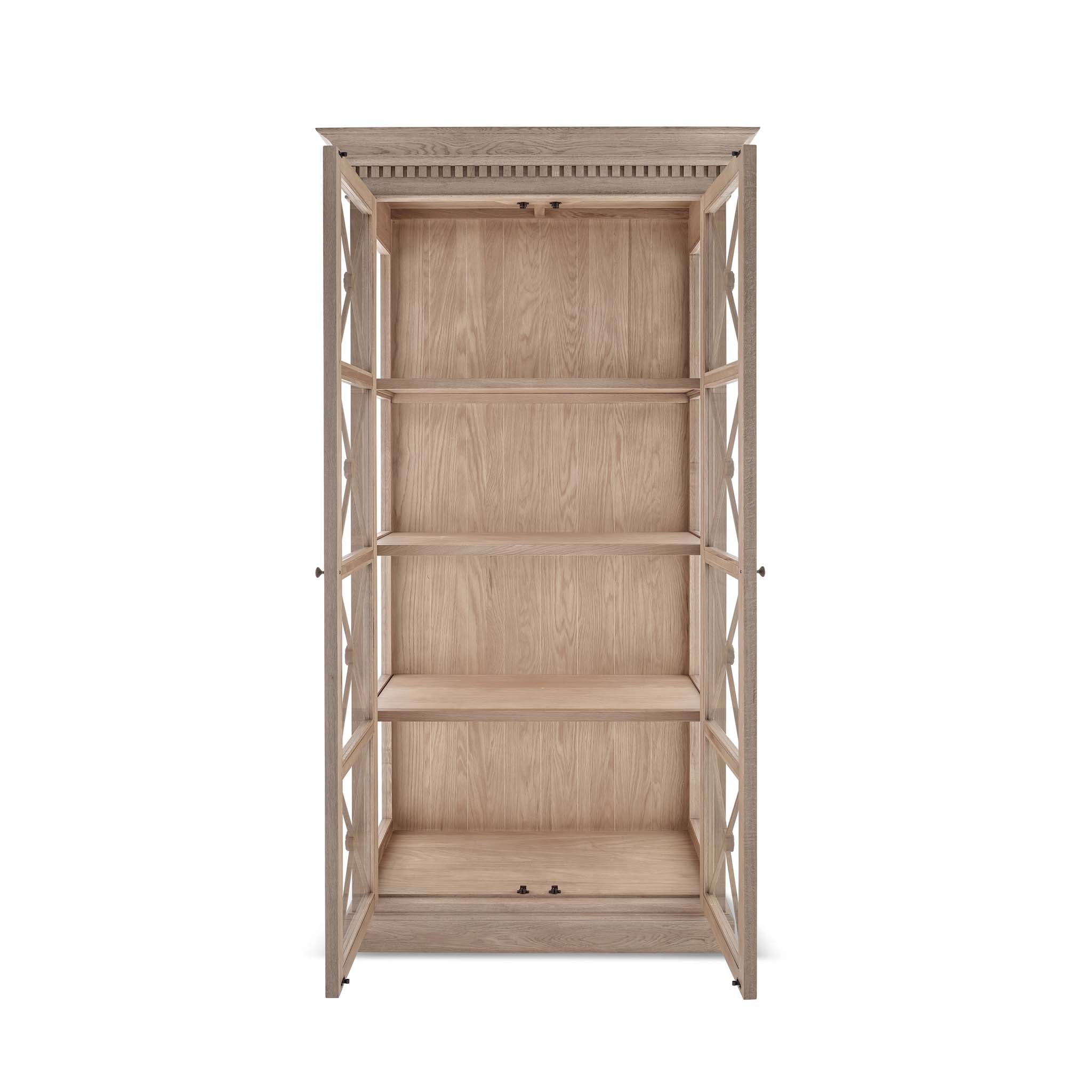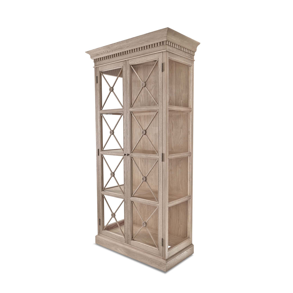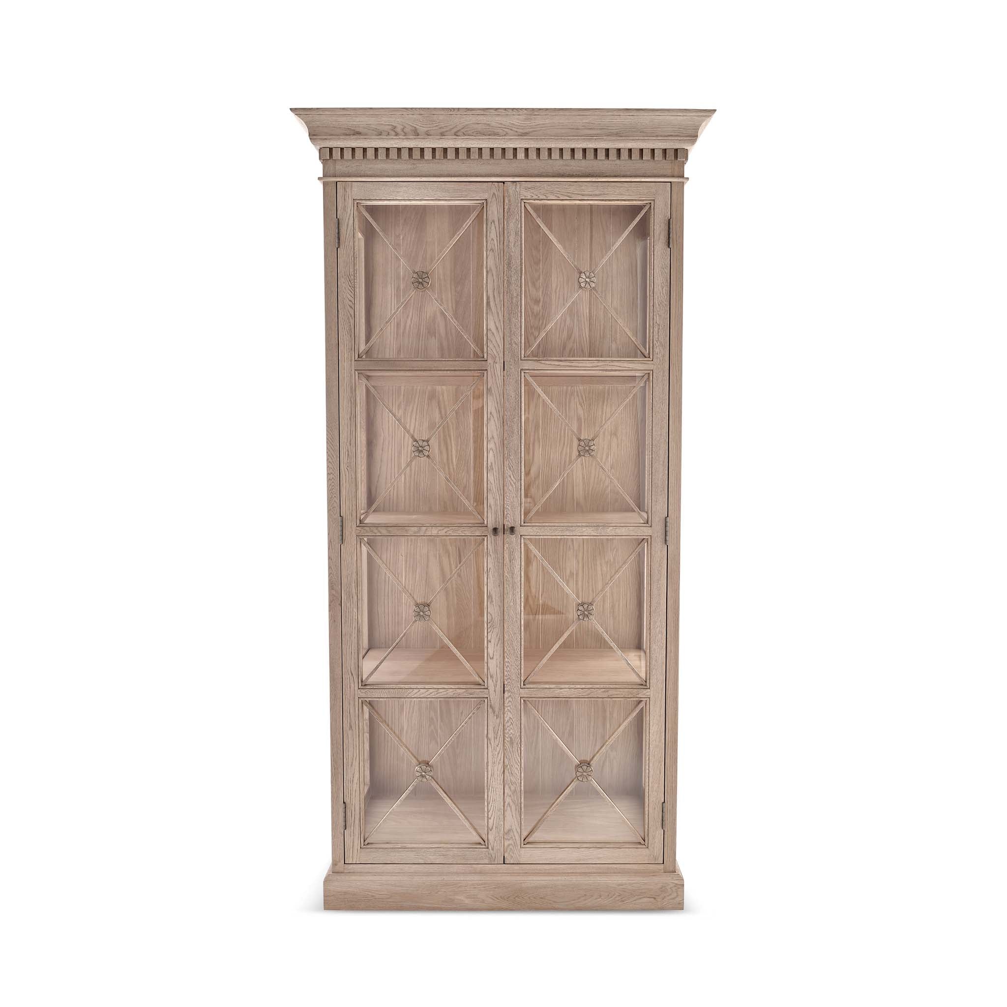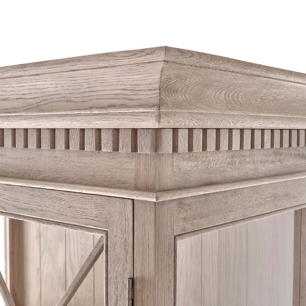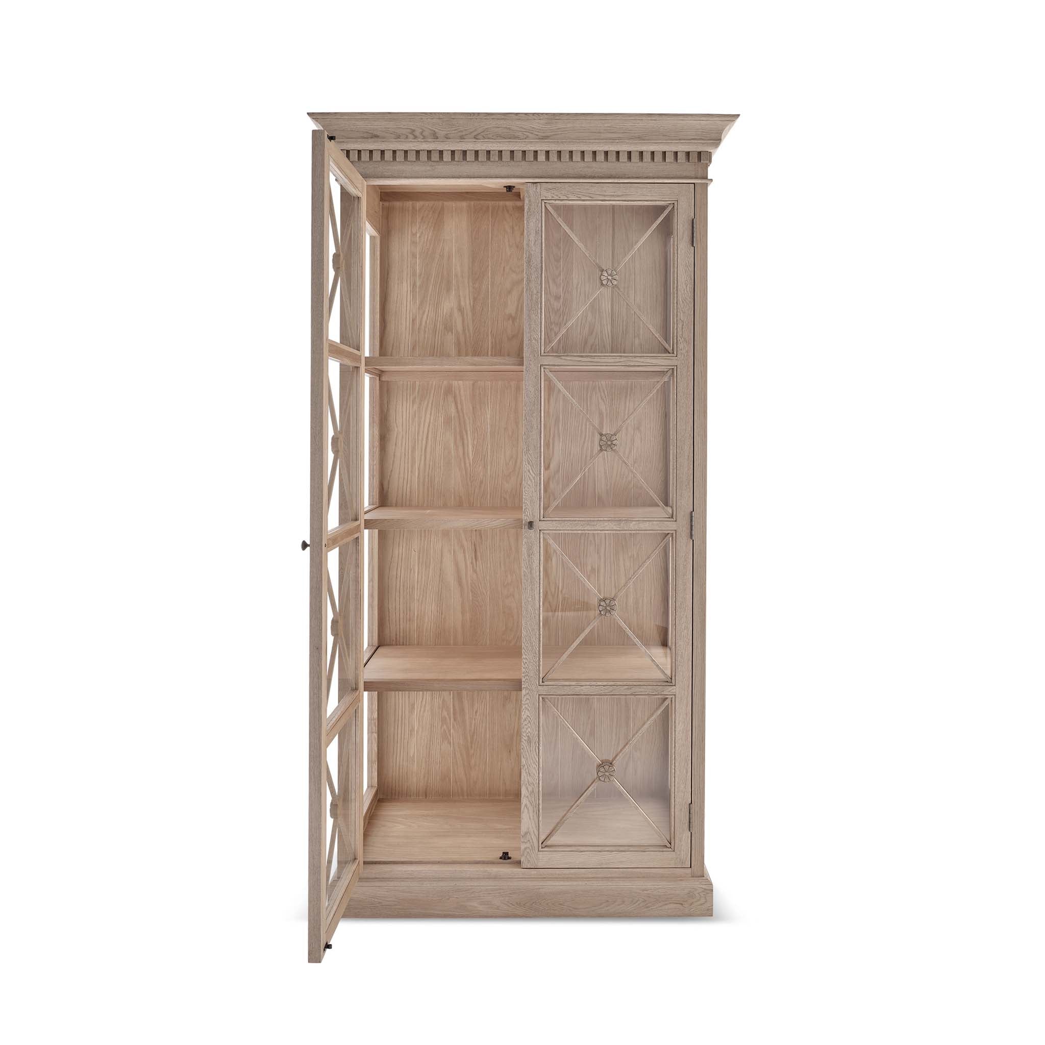 The Claremont display unit is a stunning statement piece that brings both style and functionality to your home. It features a sophisticated full-height glass-front display perfect for showcasing your cherished dinnerware or decorative items. Classic dentil moulding detail around the top edge adds an elegant finishing touch, reflecting the timeless design of the Claremont collection. Handcrafted from solid oak and finished with our signature multi-staged weathered oak finish, it highlights the wood’s natural warmth and character. Lightly wire-brushed to enhance the grain, this display unit showcases the unique texture of the oak with a more pronounced appearance. Designed to complement our Claremont dresser, console table and sideboards, this piece also beautifully complements all our other exclusive furniture collections. The Claremont display unit combines quality craftsmanship and enduring style to enhance any dining or living space.