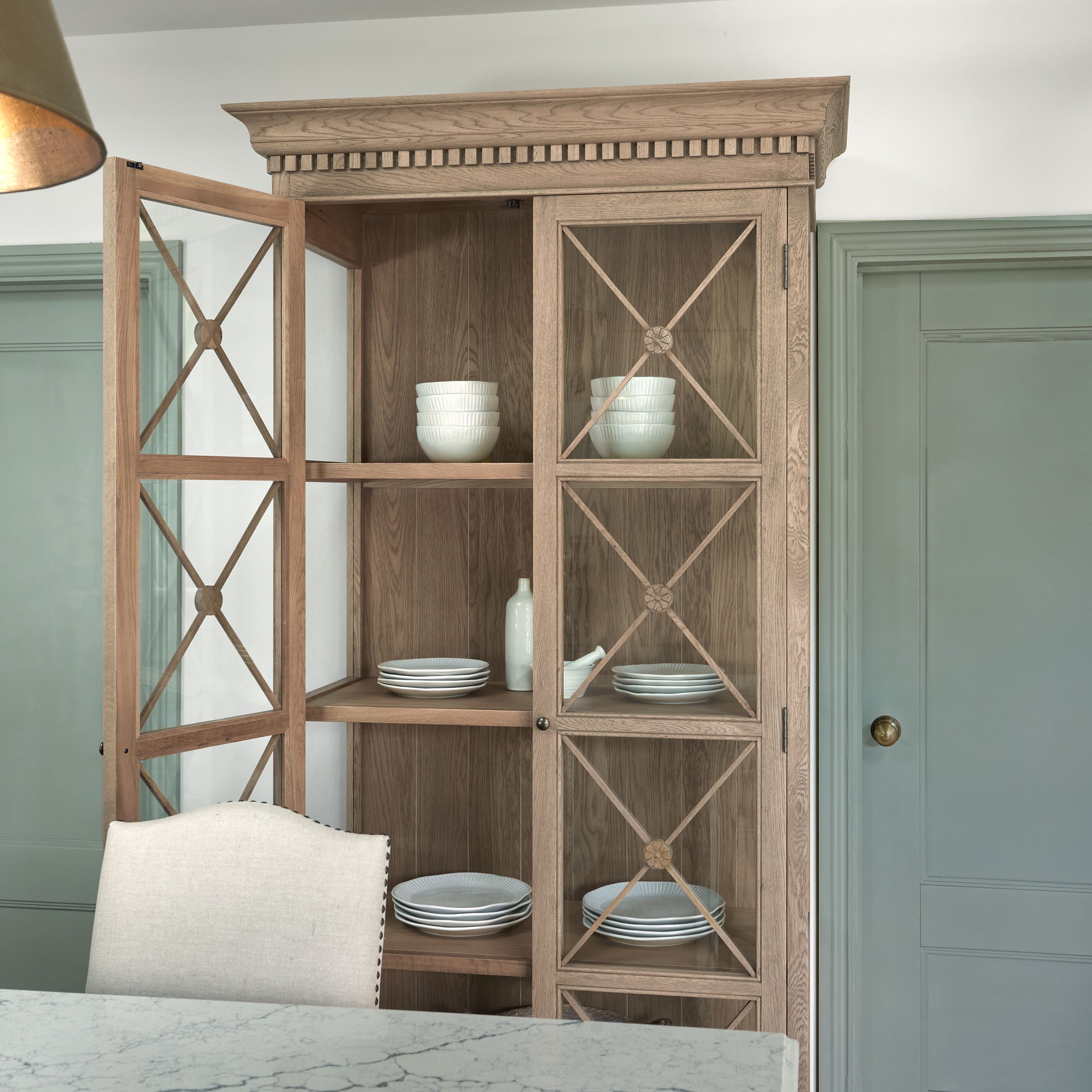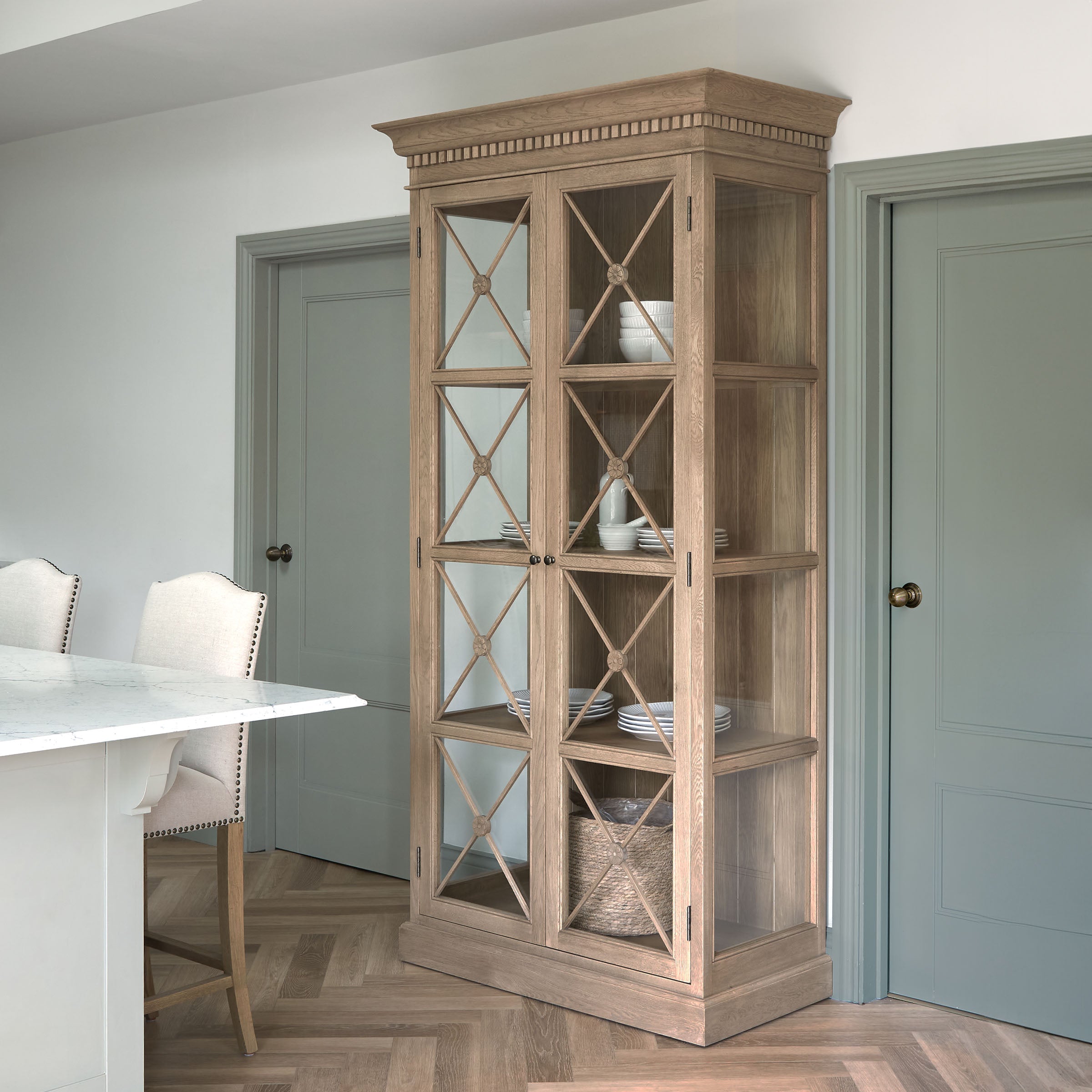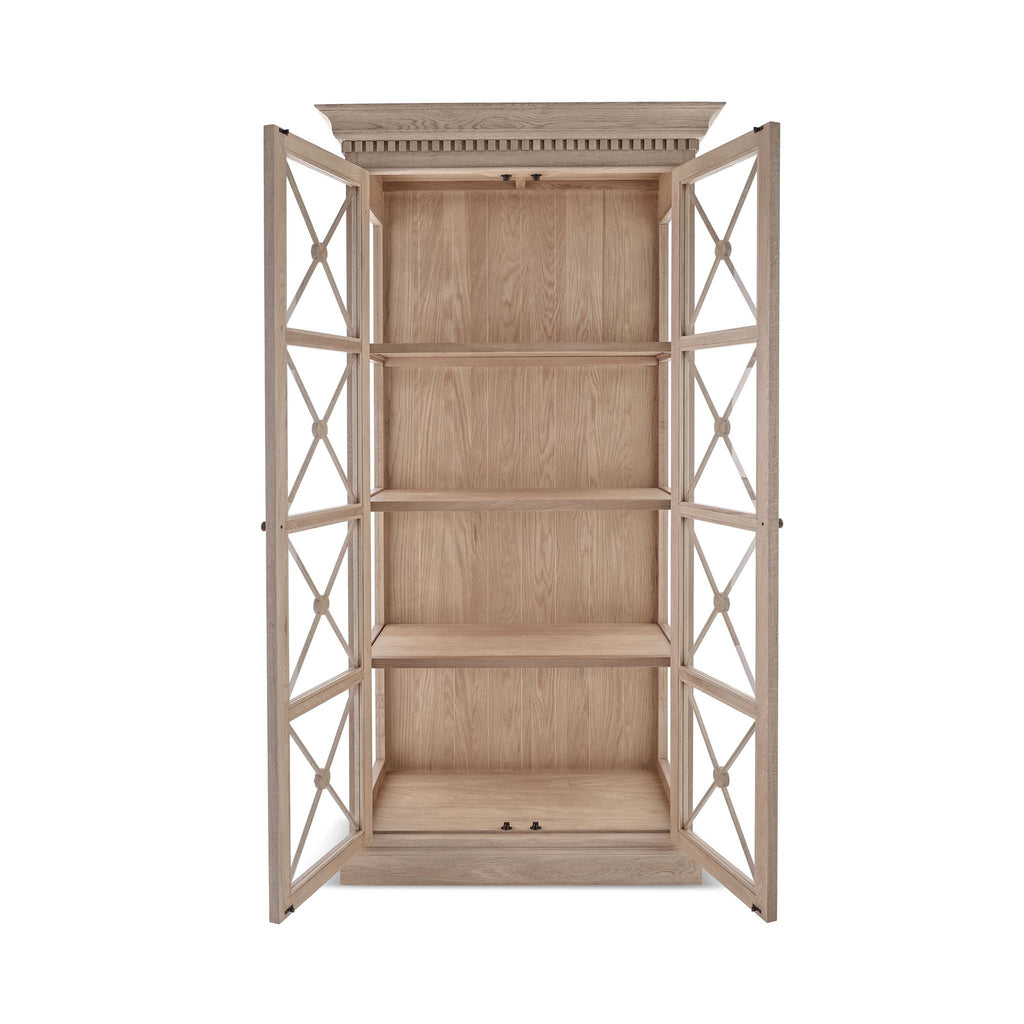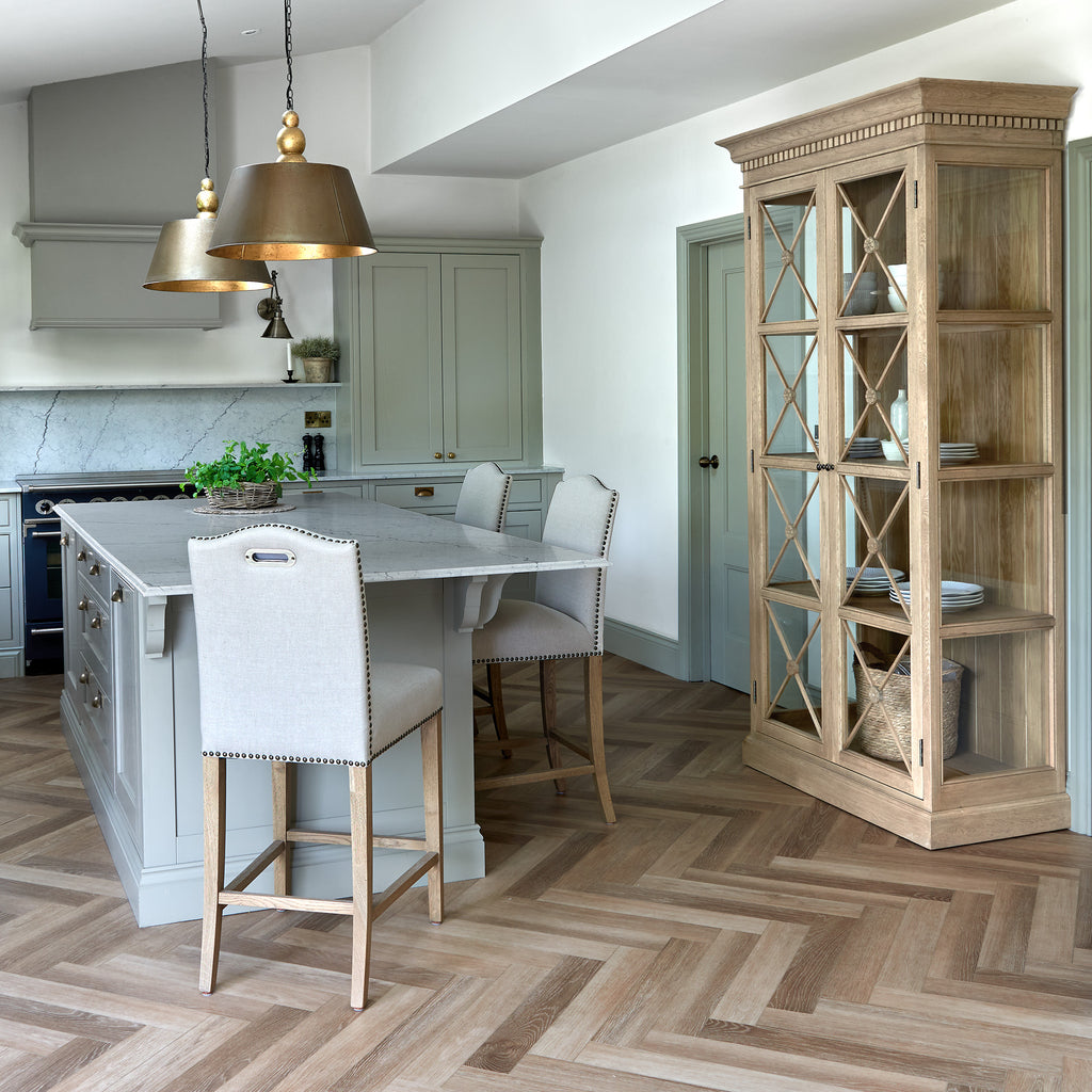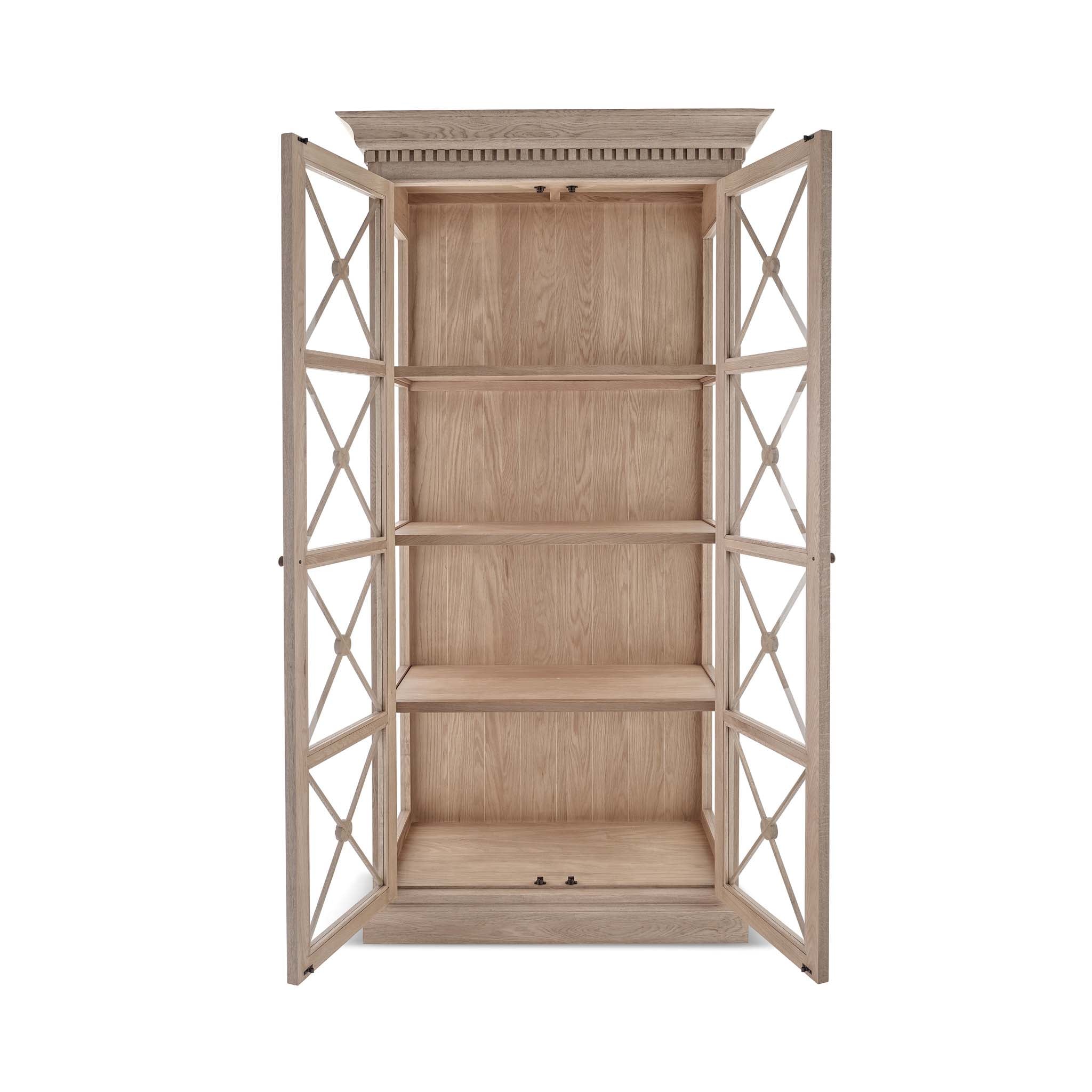 The Claremont display unit is a stunning statement piece that brings both style and functionality to your home. It features a sophisticated full-height glass-front display perfect for showcasing your cherished dinnerware or decorative items. Classic dentil moulding detail around the top edge adds an elegant finishing touch, reflecting the timeless design of the Claremont collection. Handcrafted from solid oak and finished with our signature multi-staged weathered oak finish, it highlights the wood’s natural warmth and character. Lightly wire-brushed to enhance the grain, this display unit showcases the unique texture of the oak with a more pronounced appearance. Designed to complement our Claremont dresser, console table and sideboards, this piece also beautifully complements all our other exclusive furniture collections. The Claremont display unit combines quality craftsmanship and enduring style to enhance any dining or living space.