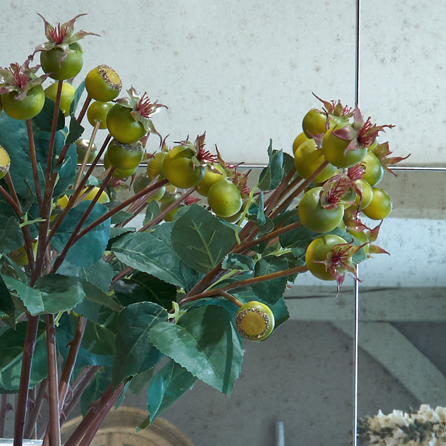 Add a touch of natural texture with this green crab apple stem, featuring clusters of small, lifelike fruit and leafy details. Its fresh green tones and realistic finish make it a perfect accent for your home. Display by itself in a tall vase or combine with other stems for a full bouquet.