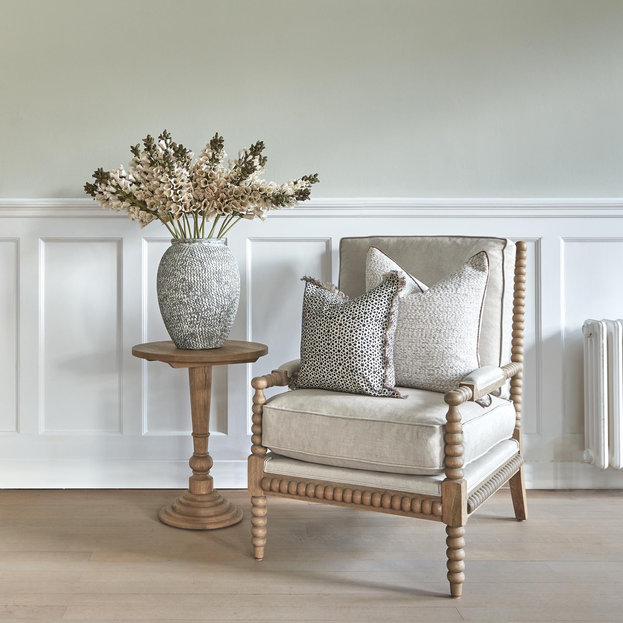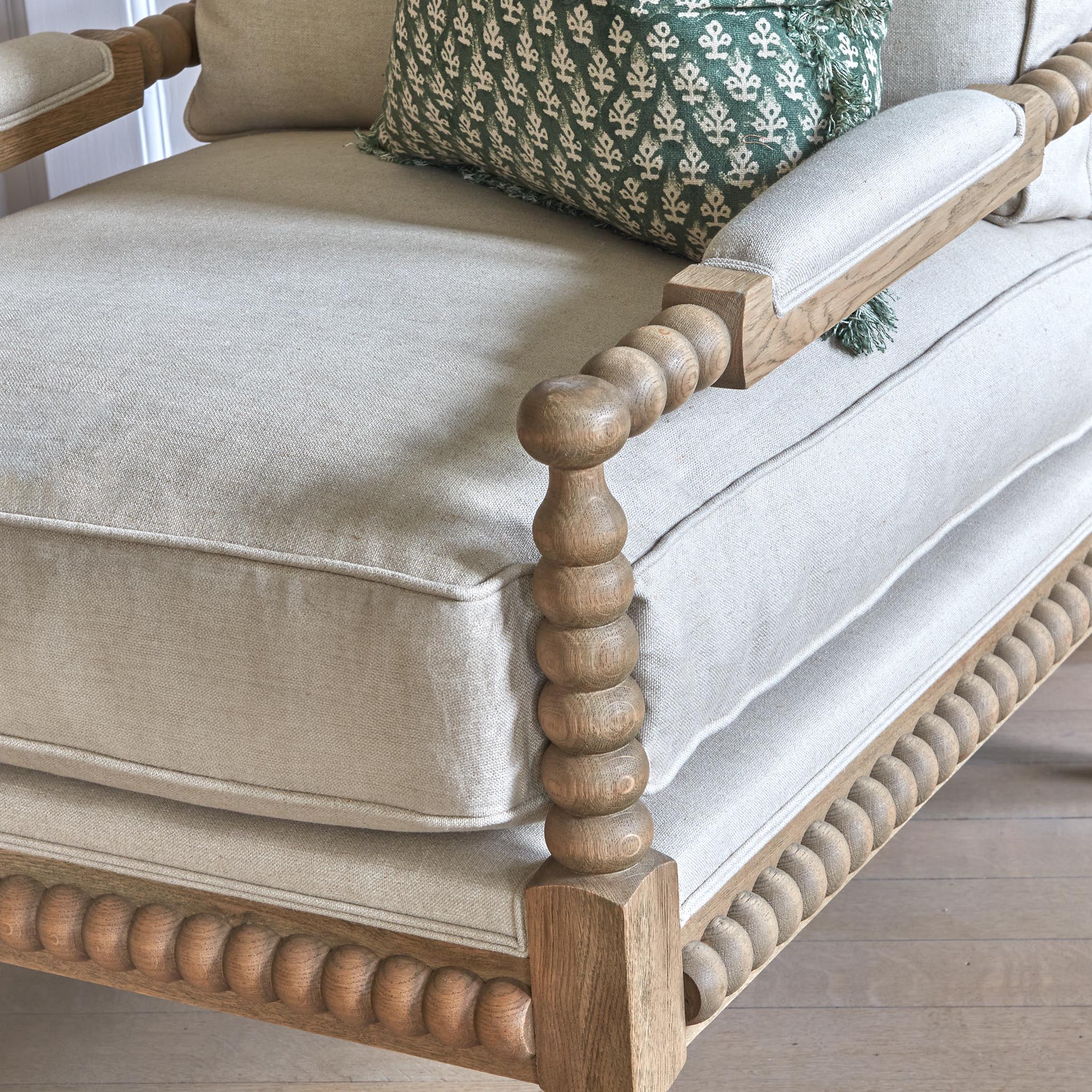 Our generously proportioned Cleveland Arm Chair is handcrafted with a sturdy and weighty solid hardwood frame and upholstered in 100% soft oatmeal Belgian linen. It features hand-upholstered back and sides, along with elegant hand-carved solid oak legs and arms. Decorative solid oak bobbin legs and arm detailing add a touch of classic craftsmanship to its refined style. The seat cushion is reversible and filled with feathers and foam for added comfort. Whether placed in a sitting room or bedroom, this timeless design complements all our other exclusive furniture collections.