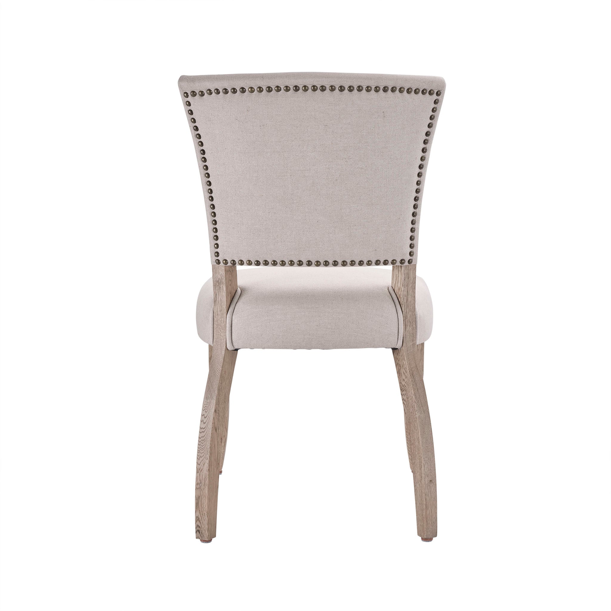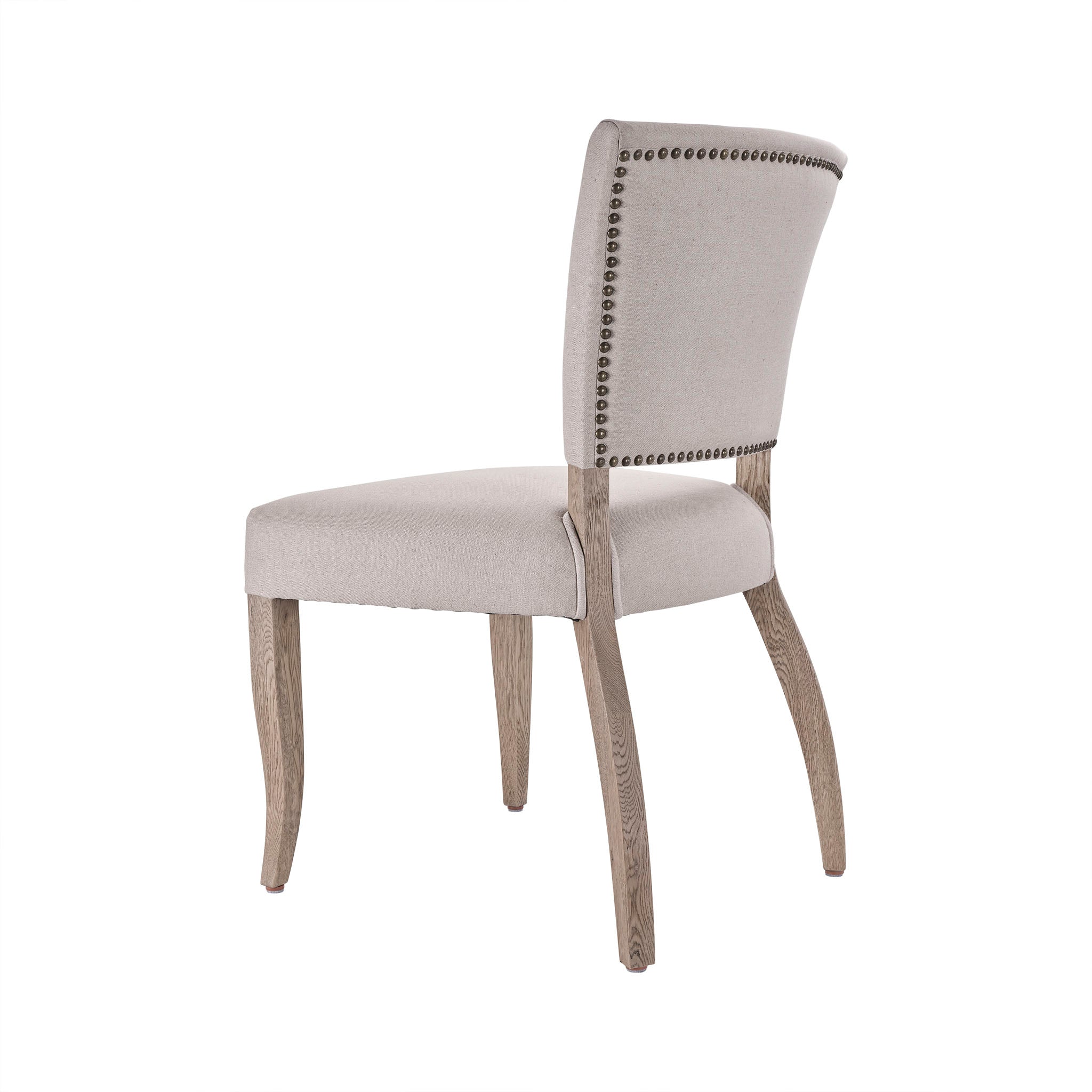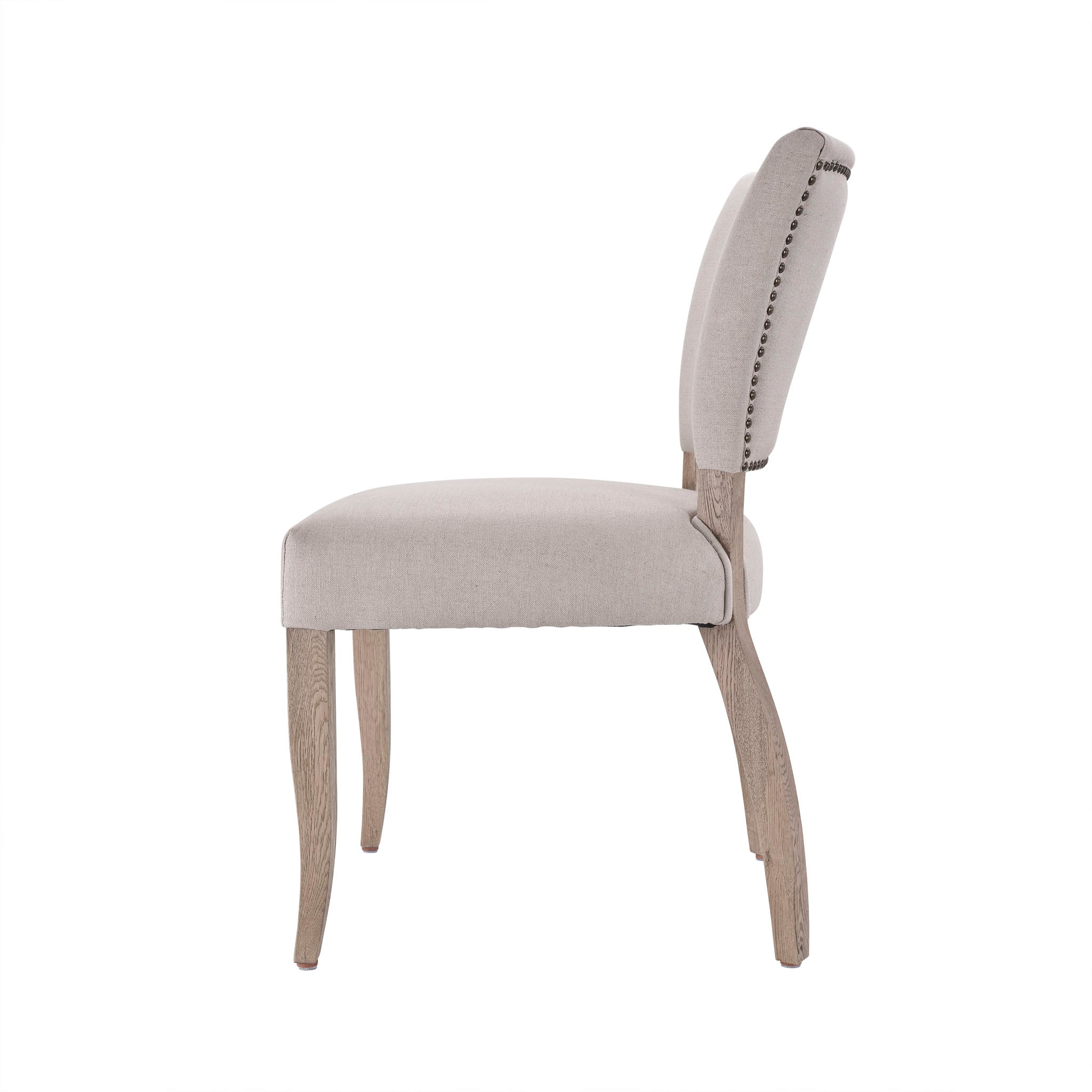 The Cavendish dining chair is handcrafted with a solid, sturdy, and weighty hardwood frame and upholstered in 100% soft oatmeal Belgian linen. It features a smooth, gently curved back and a seat filled with high-density, comfortable foam to provide lasting comfort while enjoying memorable meals with friends and family. Elegant brass stud detailing runs along the edges which adds a refined finishing touch. The solid oak legs are hand-finished in our signature weathered oak to complement all our other exclusive dining table collections.