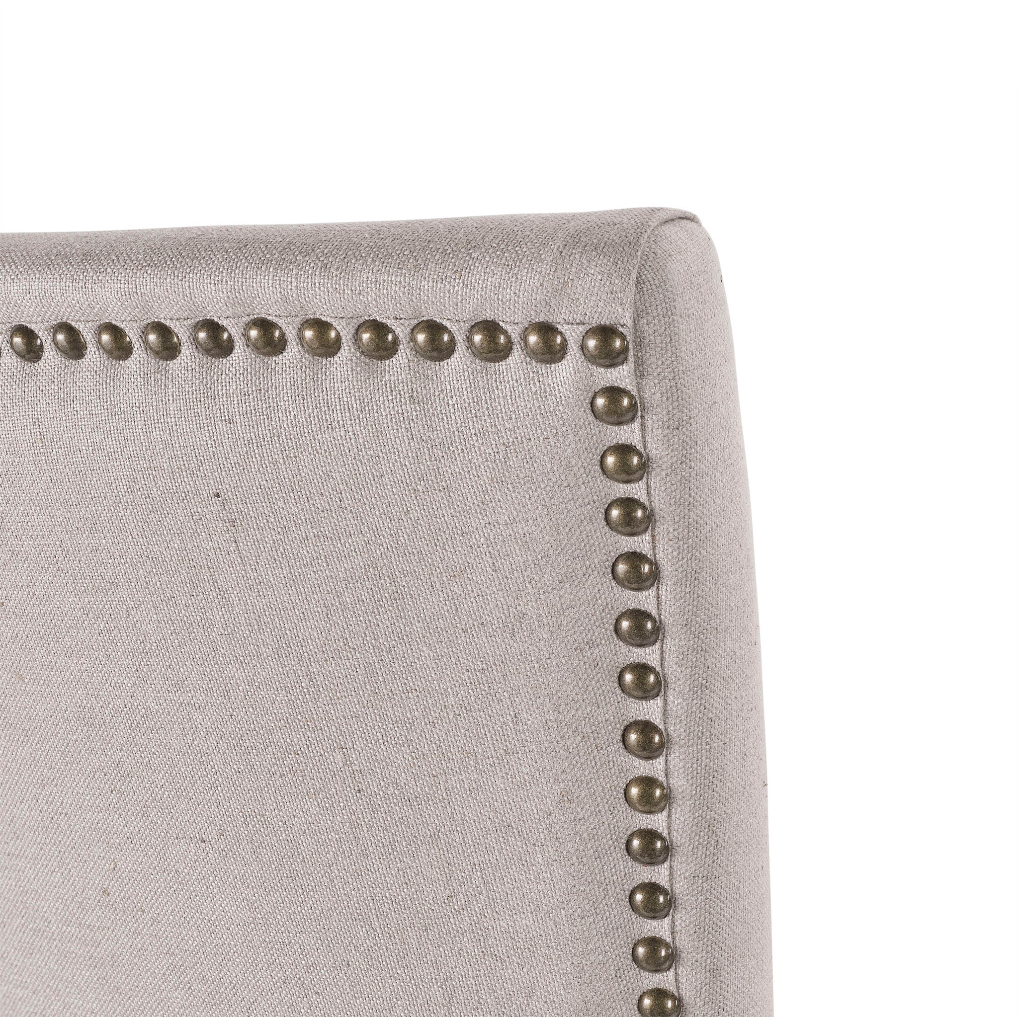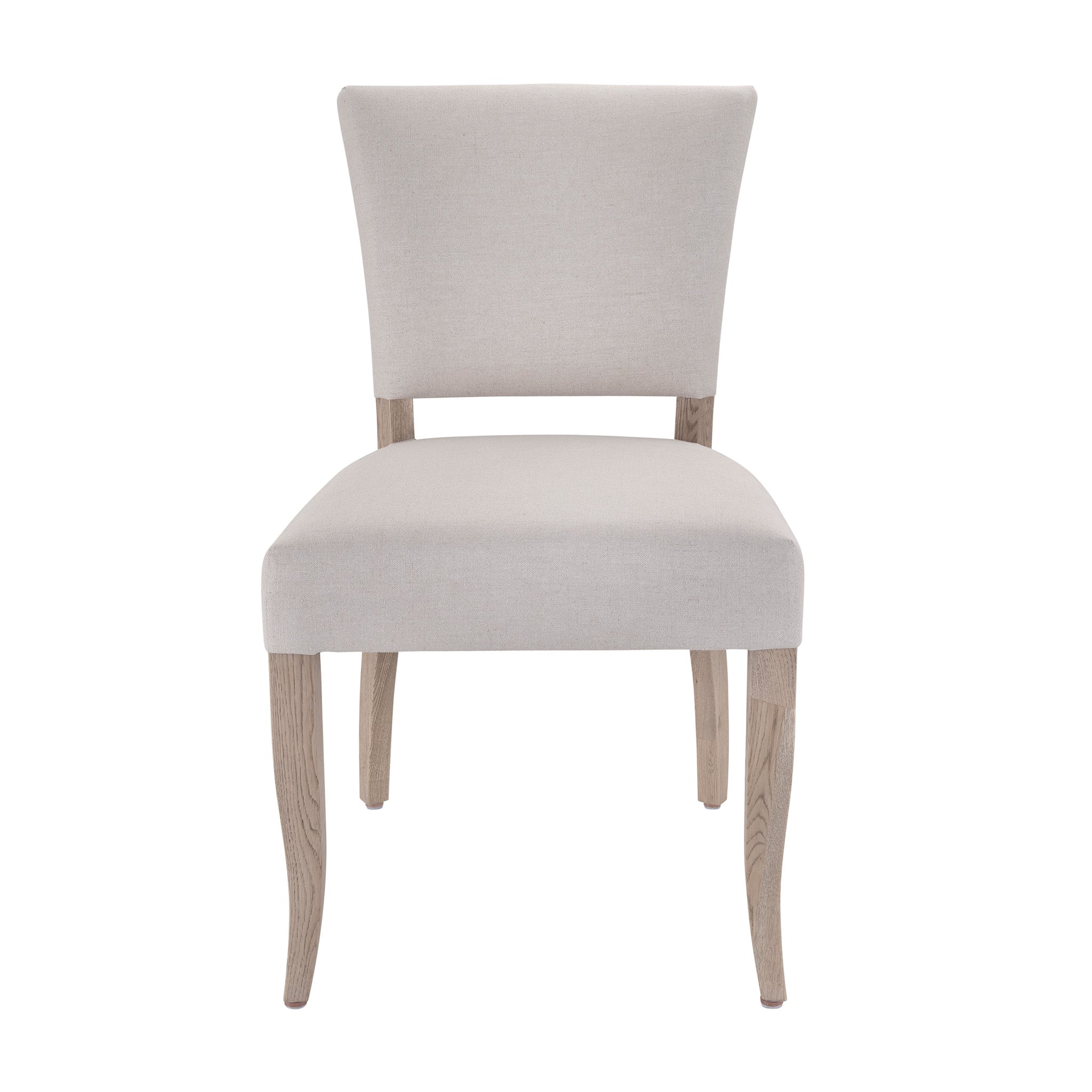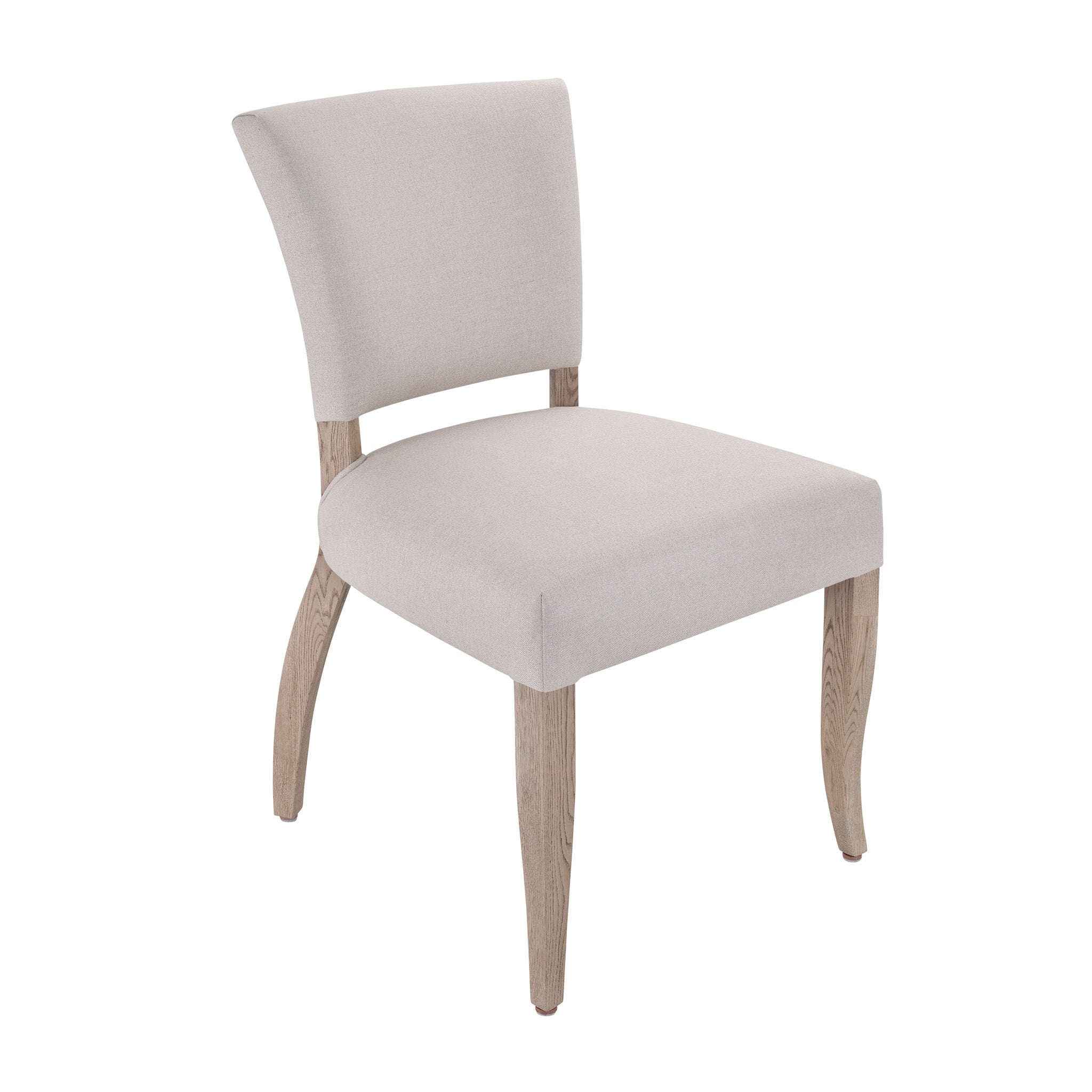 The Cavendish dining chair is handcrafted with a solid, sturdy, and weighty hardwood frame and upholstered in 100% soft oatmeal Belgian linen. It features a smooth, gently curved back and a seat filled with high-density, comfortable foam to provide lasting comfort while enjoying memorable meals with friends and family. Elegant brass stud detailing runs along the edges which adds a refined finishing touch. The solid oak legs are hand-finished in our signature weathered oak to complement all our other exclusive dining table collections.