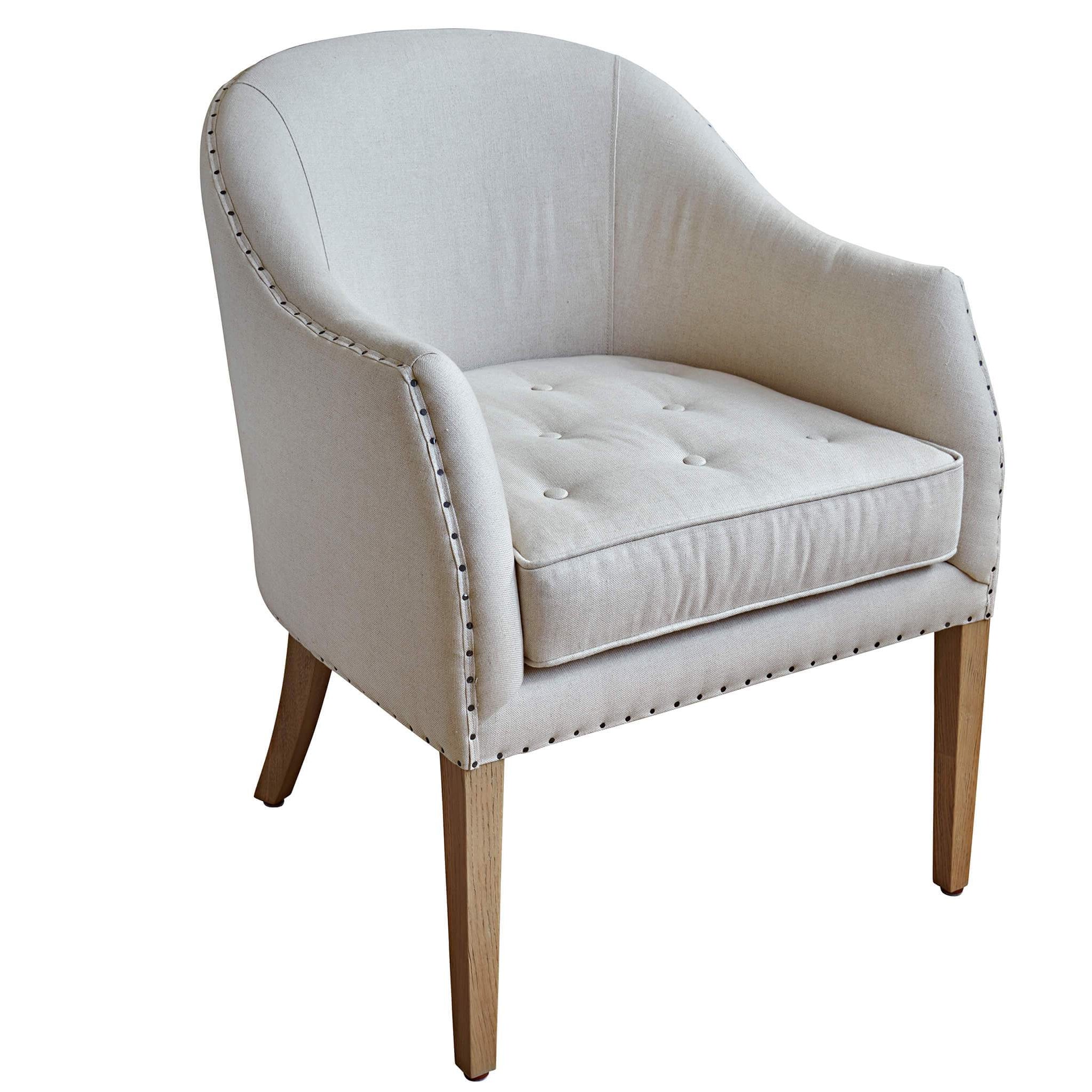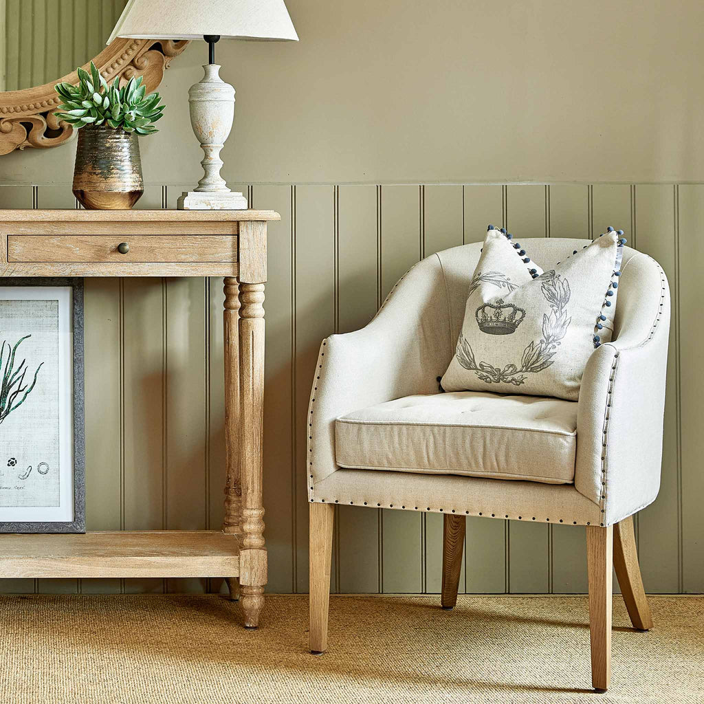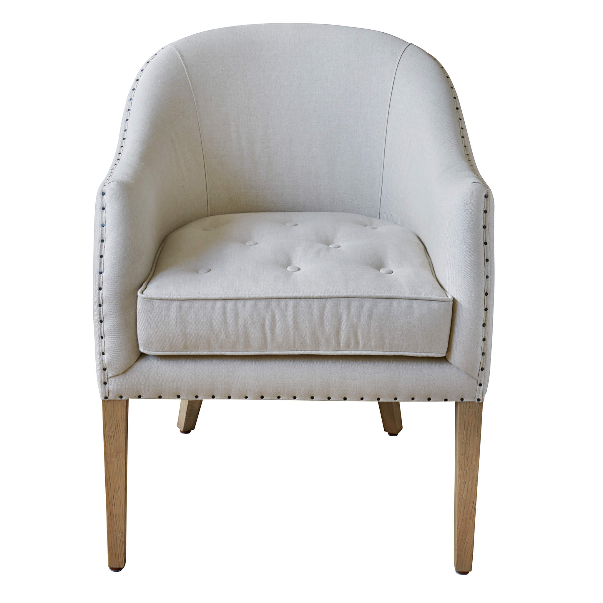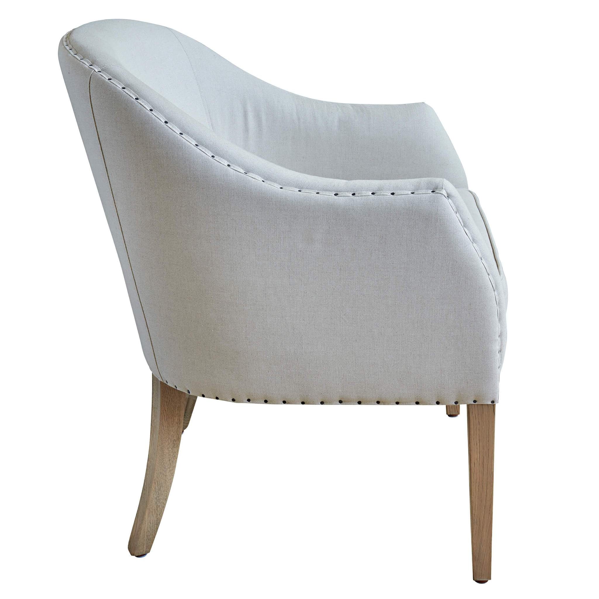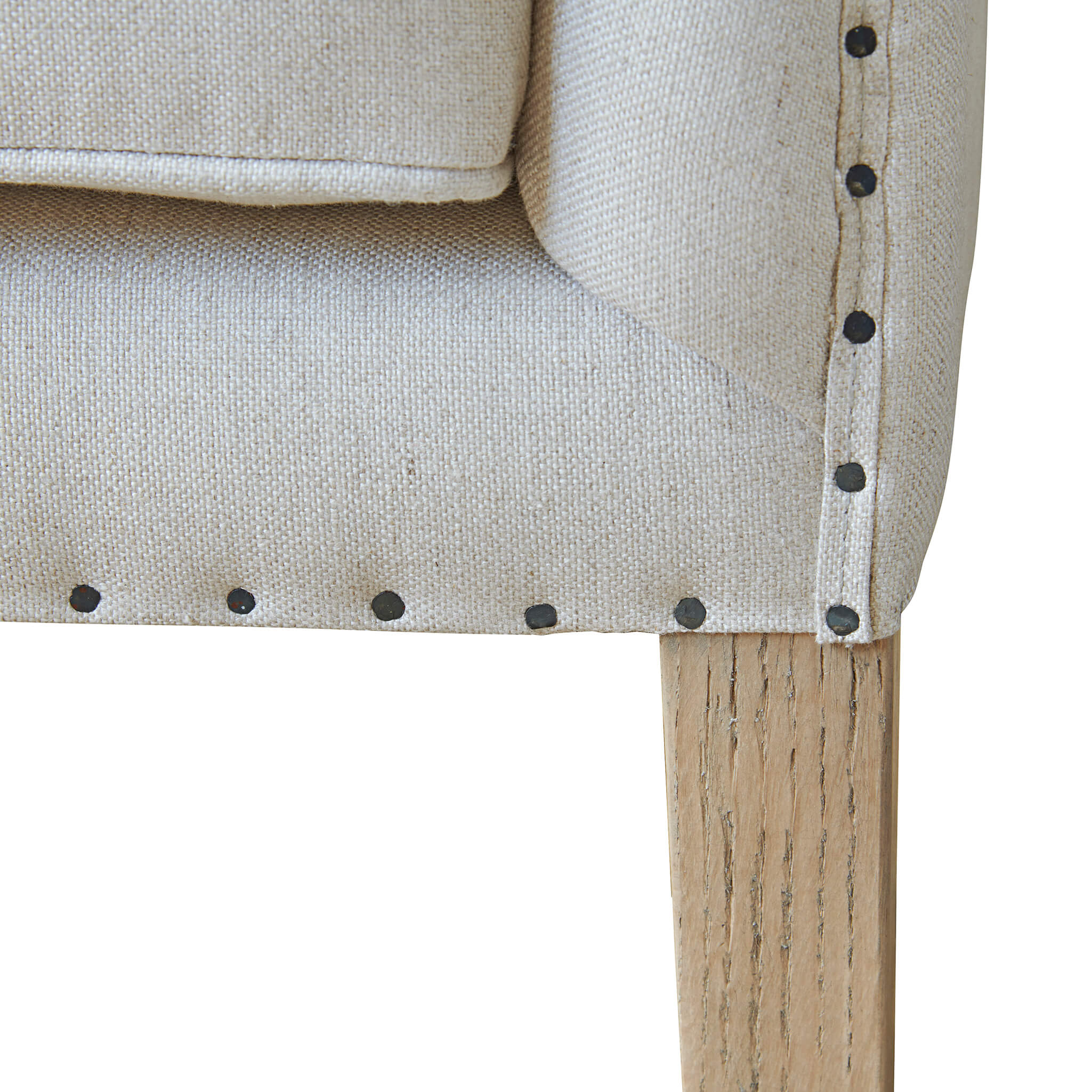 Our small oatmeal Annabel armchair has soft, rounded curves and a subtle contemporary brushed brass nailhead trim. Perfect for a bedroom or as a pair in a sitting room, the pretty and petite chair is hand-upholstered in our 100% Belgian linen, and is filled with feather and foam for extra comfort with reversible cushions. This chair is handcrafted from a sturdy and weighty solid hardwood frame, and the legs are made from solid oak and finished in our signature weathered oak, ensuring this piece perfectly complements all of our other furniture collections.