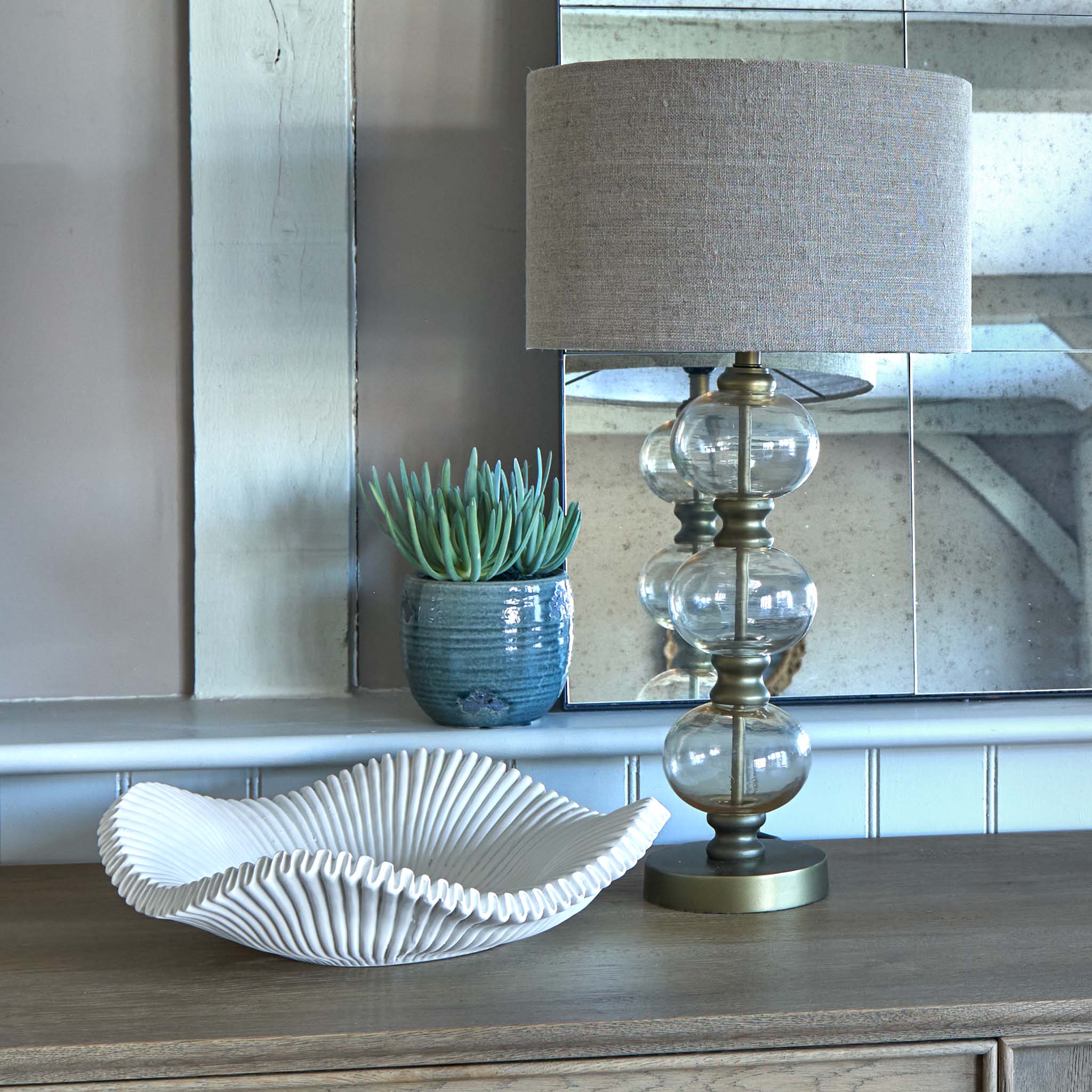 The Antique Gold and Glass Bobble Lamp with Shade brings a touch of elegance to any room with its unique design and warm, ambient glow. The antique gold finish paired with the glass bobble detail creates a striking yet sophisticated look, perfect for adding character to your space. The soft light it emits enhances the atmosphere, making it ideal for both modern and classic interiors. With its timeless style, this lamp is sure to be a standout feature in your home.