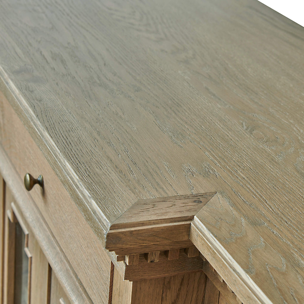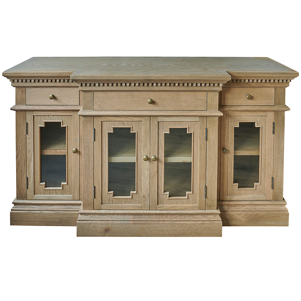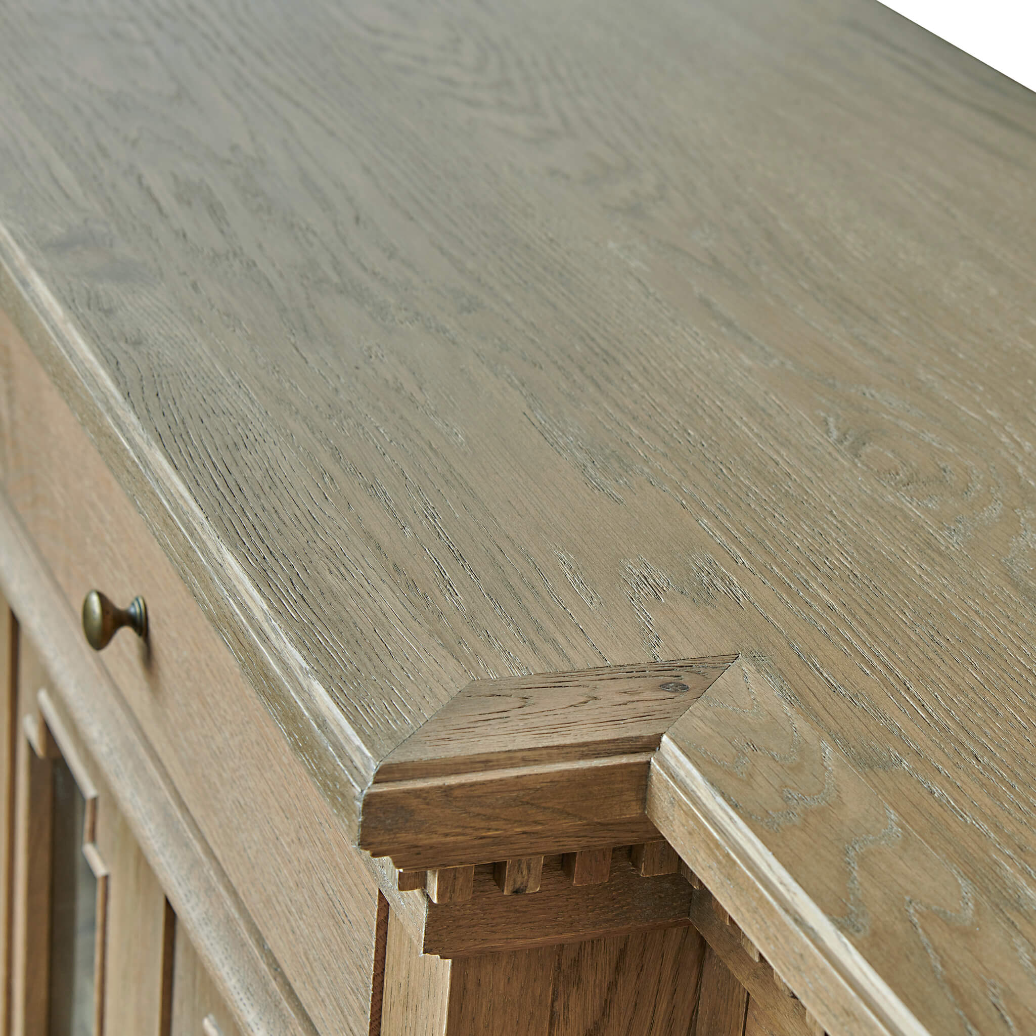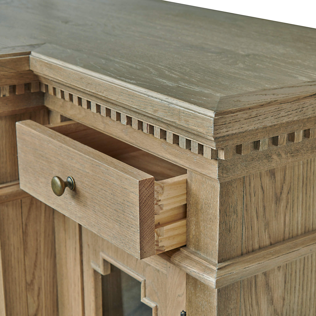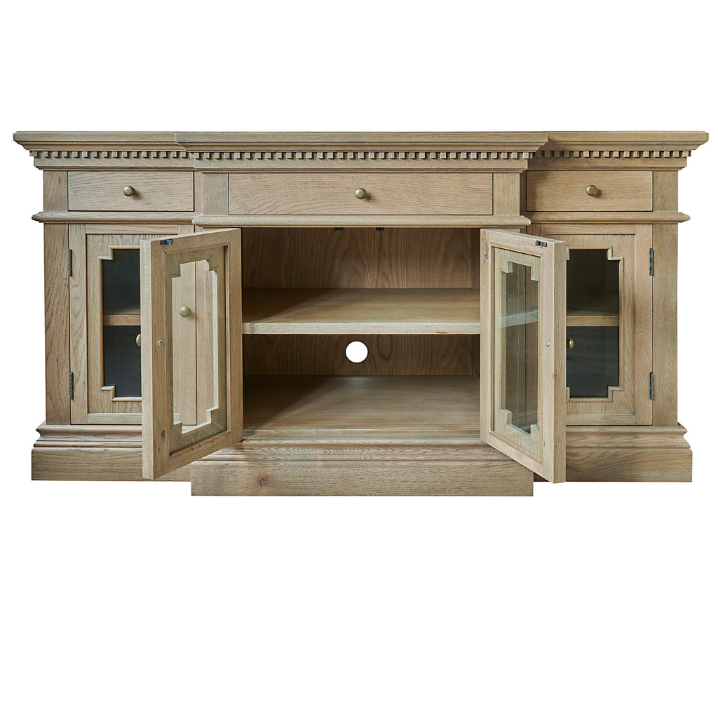 The Claremont media unit is not only a beautiful statement piece but also a practical solution for storing your digital entertainment equipment. Handcrafted from solid oak and finished with our signature multi-staged weathered oak finish, it enhances the wood’s natural warmth and character. This piece has been lightly wire-brushed to bring out the grain of the wood, giving it a more pronounced appearance and highlighting the unique texture of the oak. It features three drawers and three shelved cabinets with glazed doors in an eye-catching geometric pattern, finished with attractive dentil moulding and brass knobs. The cabinet is generously sized to support a 60-inch widescreen TV on top, or you could mount a TV to the wall above it as well. This unit complements all our other exclusive furniture collections.