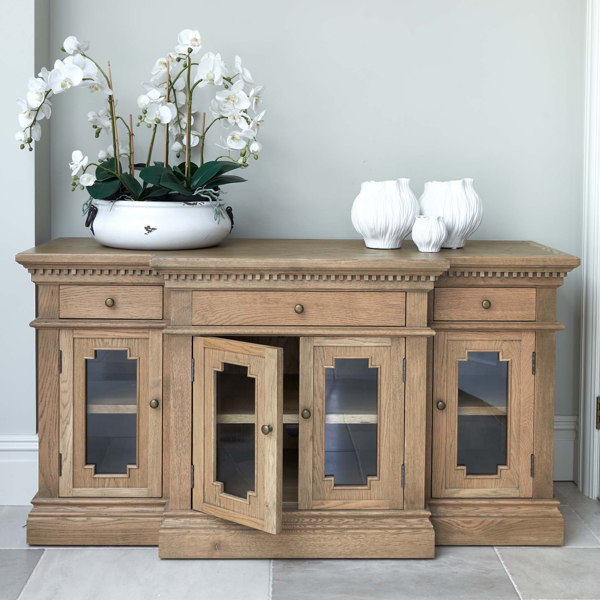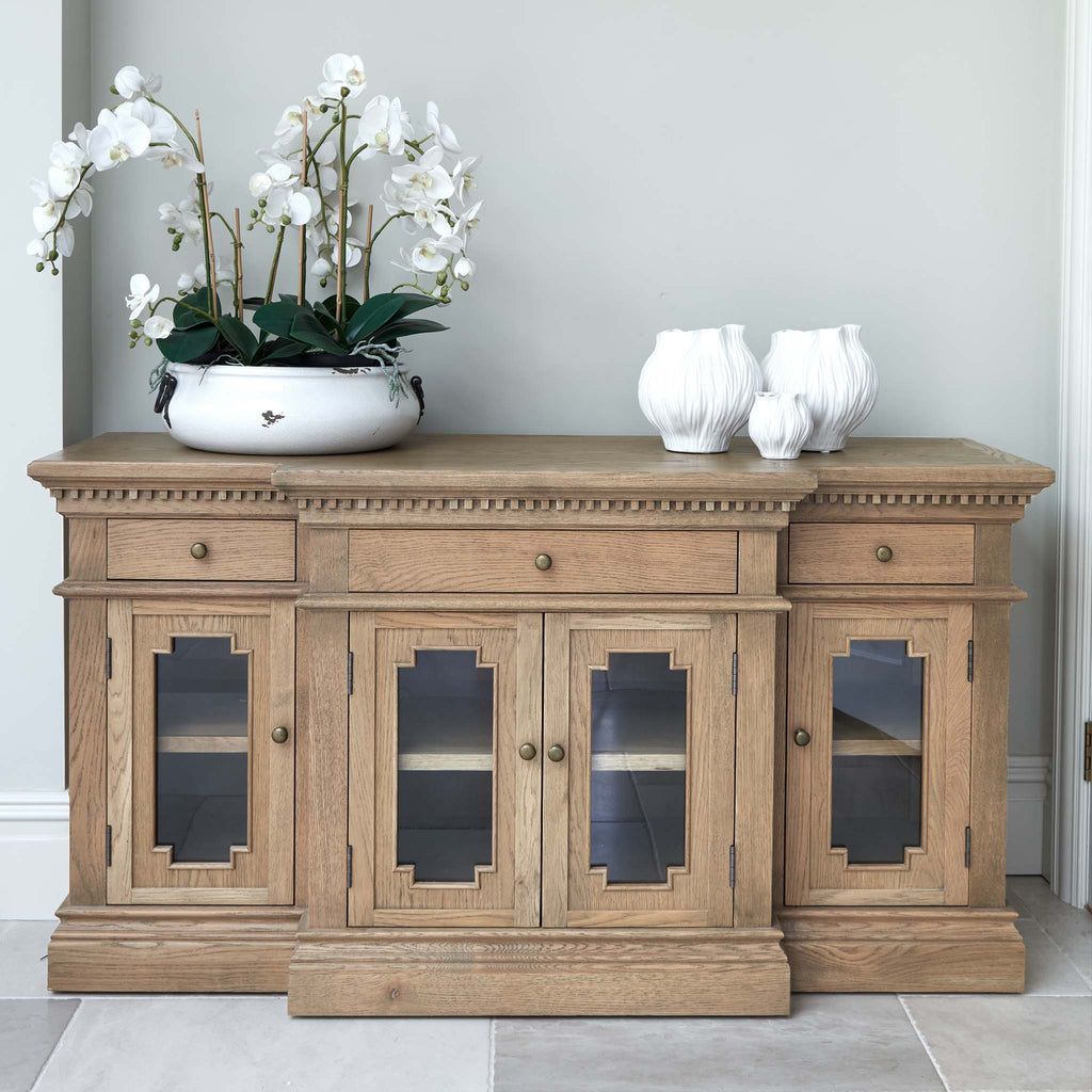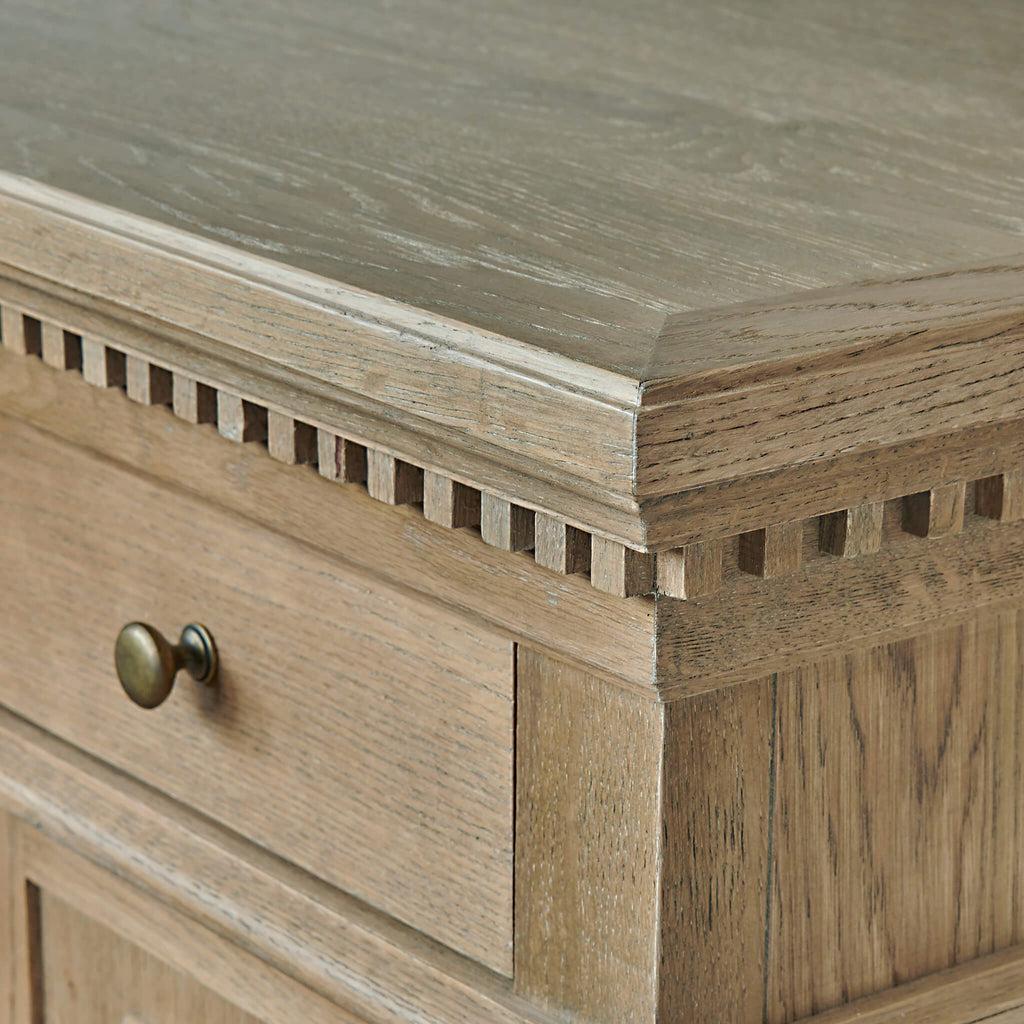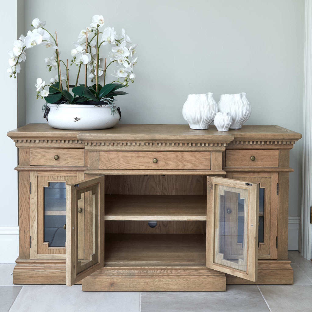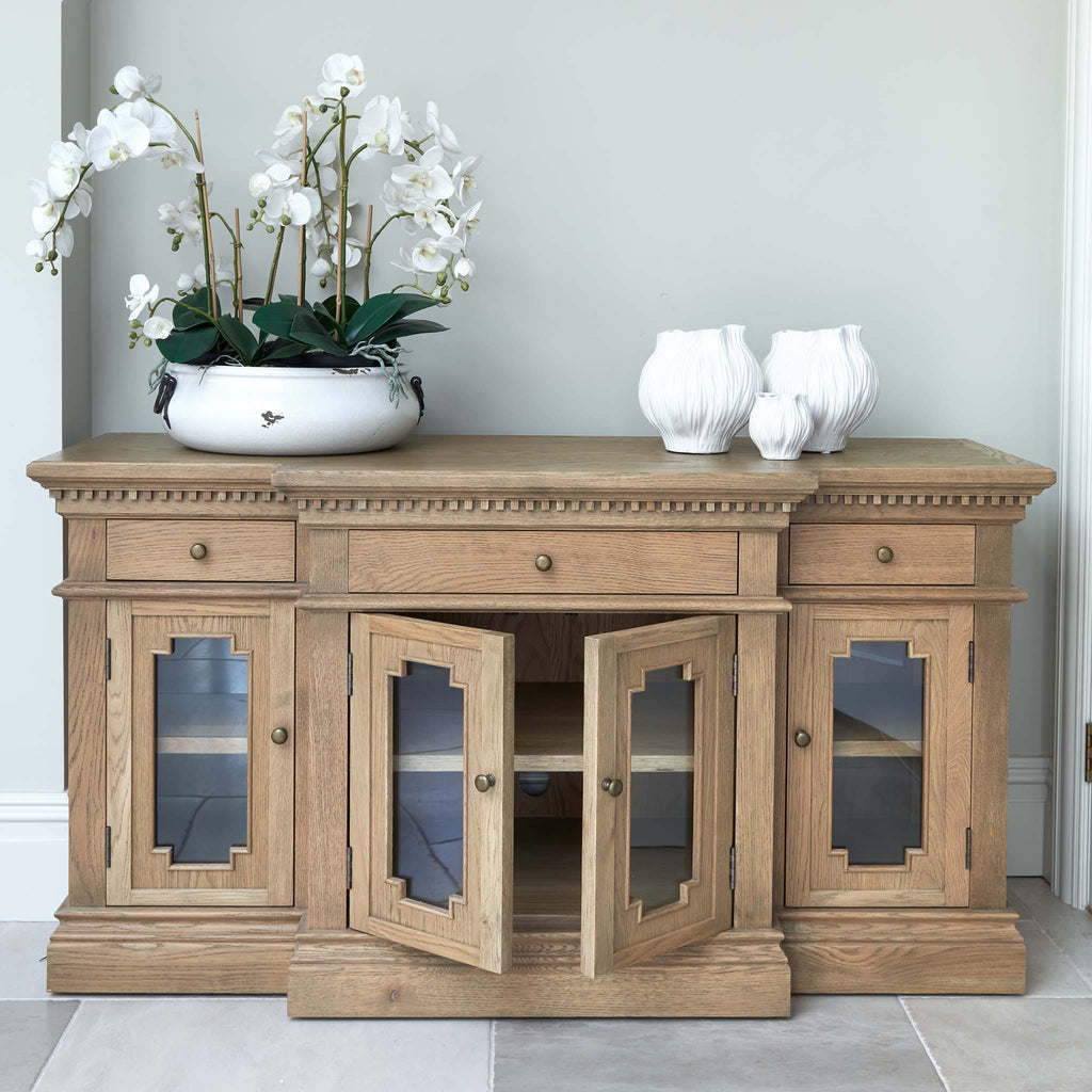 The Claremont media unit is not only a beautiful statement piece but also a practical solution for storing your digital entertainment equipment. Handcrafted from solid oak and finished with our signature multi-staged weathered oak finish, it enhances the wood’s natural warmth and character. This piece has been lightly wire-brushed to bring out the grain of the wood, giving it a more pronounced appearance and highlighting the unique texture of the oak. It features three drawers and three shelved cabinets with glazed doors in an eye-catching geometric pattern, finished with attractive dentil moulding and brass knobs. The cabinet is generously sized to support a 60-inch widescreen TV on top, or you could mount a TV to the wall above it as well. This unit complements all our other exclusive furniture collections.
