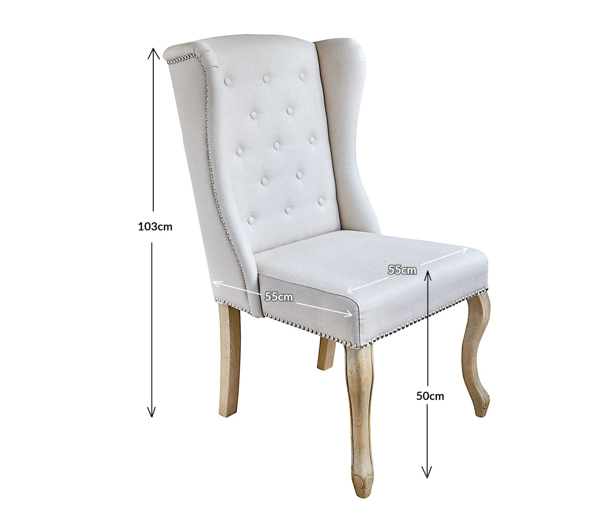 The luxurious Kingsley dining chair is handcrafted with a solid, sturdy, and weighty hardwood frame and upholstered in 100% soft oatmeal Belgian linen. It features a deep-buttoned, hand-upholstered back and a seat filled with high-density, comfortable foam to ensure lasting comfort while enjoying memorable meals with friends and family. Elegant brass stud detailing adds a refined finish, while the solid oak legs are hand-finished in our signature weathered oak to complement all of our other exclusive dining table collections. Whether styled in a set or mixed with other dining chairs from our collection, the Kingsley brings timeless elegance to any dining space.