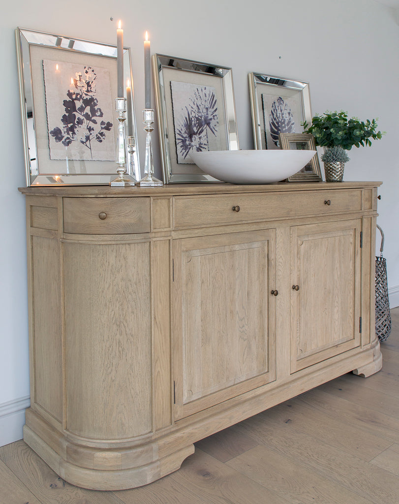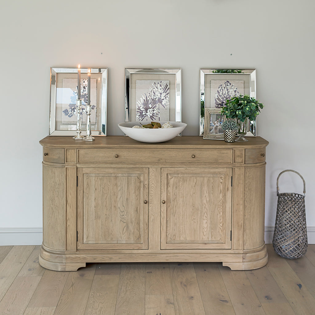 The Belmont Weathered Oak Sideboard offers generous storage with three drawers, with the central drawer featuring elegant dovetail joints. It provides plenty of space for your favourite dinner service, perfect for special occasions. This piece has been lightly wire-brushed to enhance the grain of the wood to give it a more pronounced appearance and to highlight the unique texture of the oak. Hand crafted from solid oak and finished with our signature multi-staged weathered oak finish to enhance the wood’s natural warmth and character. Designed to complement our Belmont dining table, this sideboard complements all our other exclusive furniture collections, combining practical storage with timeless style.