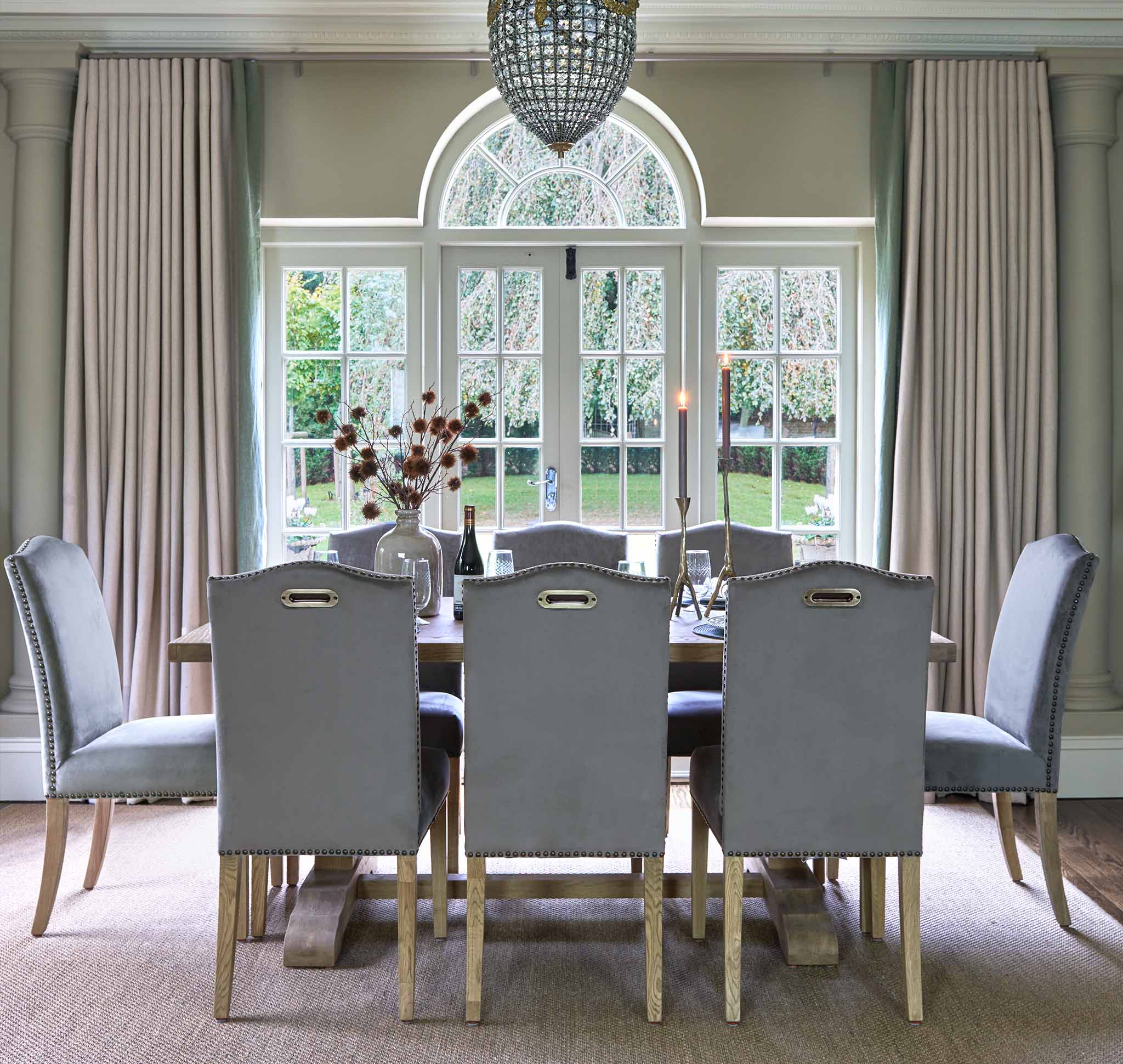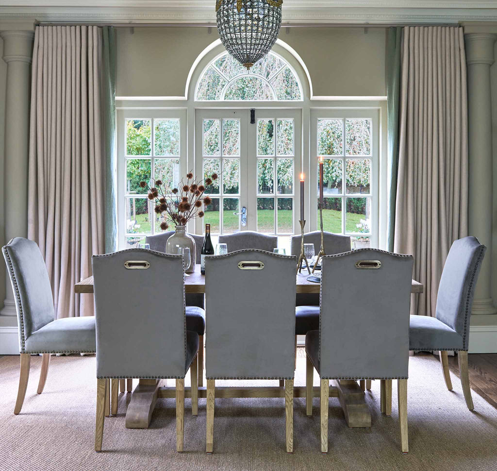 - Brushed brass handle set into the rear of the chair adds a contemporary luxury feel and is practical for pulling chairs out or moving them around a table.