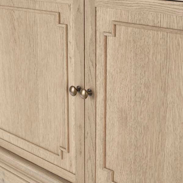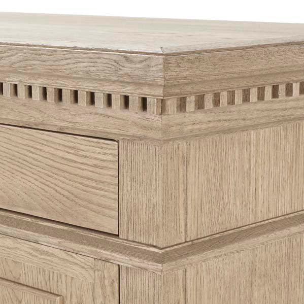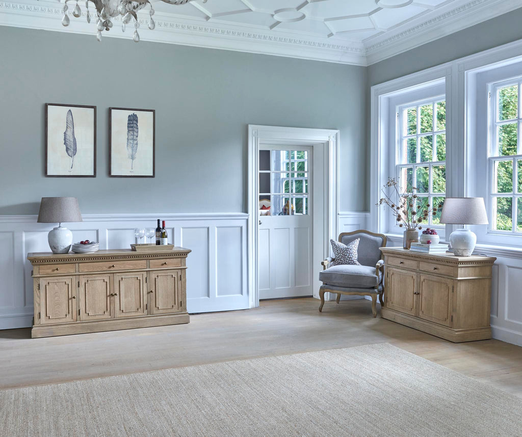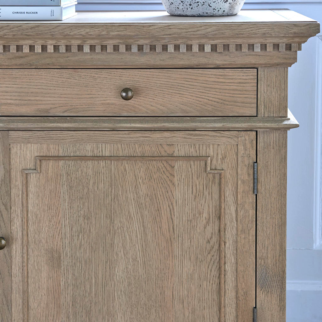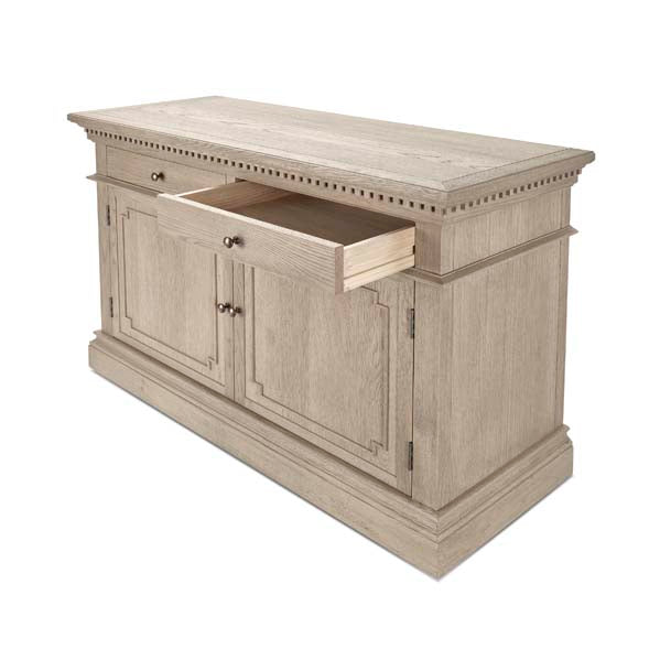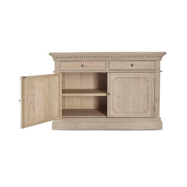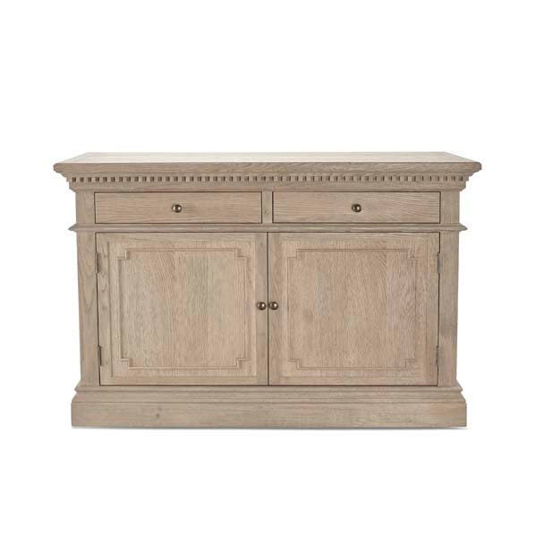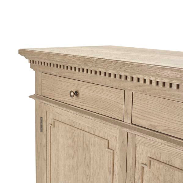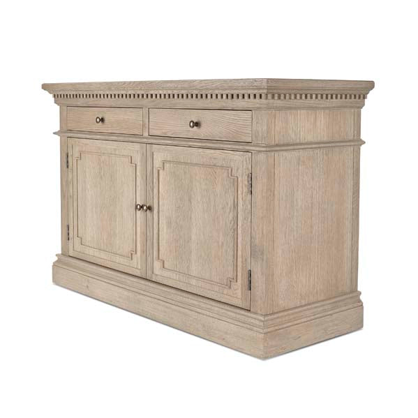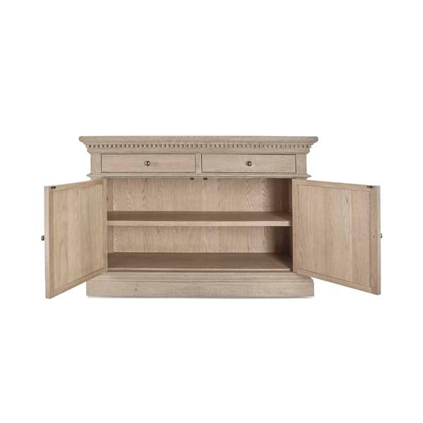 The Small Claremont Sideboard features two spacious cupboards and two drawers, providing elegant storage for everything from fine dinnerware to everyday dining essentials. Also available in a larger size, this piece allows you to curate a complete and cohesive look throughout your home. This piece has been lightly wire-brushed to enhance the grain of the wood to give it a more pronounced appearance and to highlight the unique texture of the oak. Hand crafted from solid oak and finished with our signature multi-staged weathered oak finish to enhance the wood’s natural warmth and character. Its classic design, finished with the collection’s signature dentil moulding detail, pairs beautifully with our Claremont Dresser and complements all our other exclusive furniture collections. The Small Claremont Sideboard combines timeless style with everyday practicality, making it a refined addition to any dining or living space.