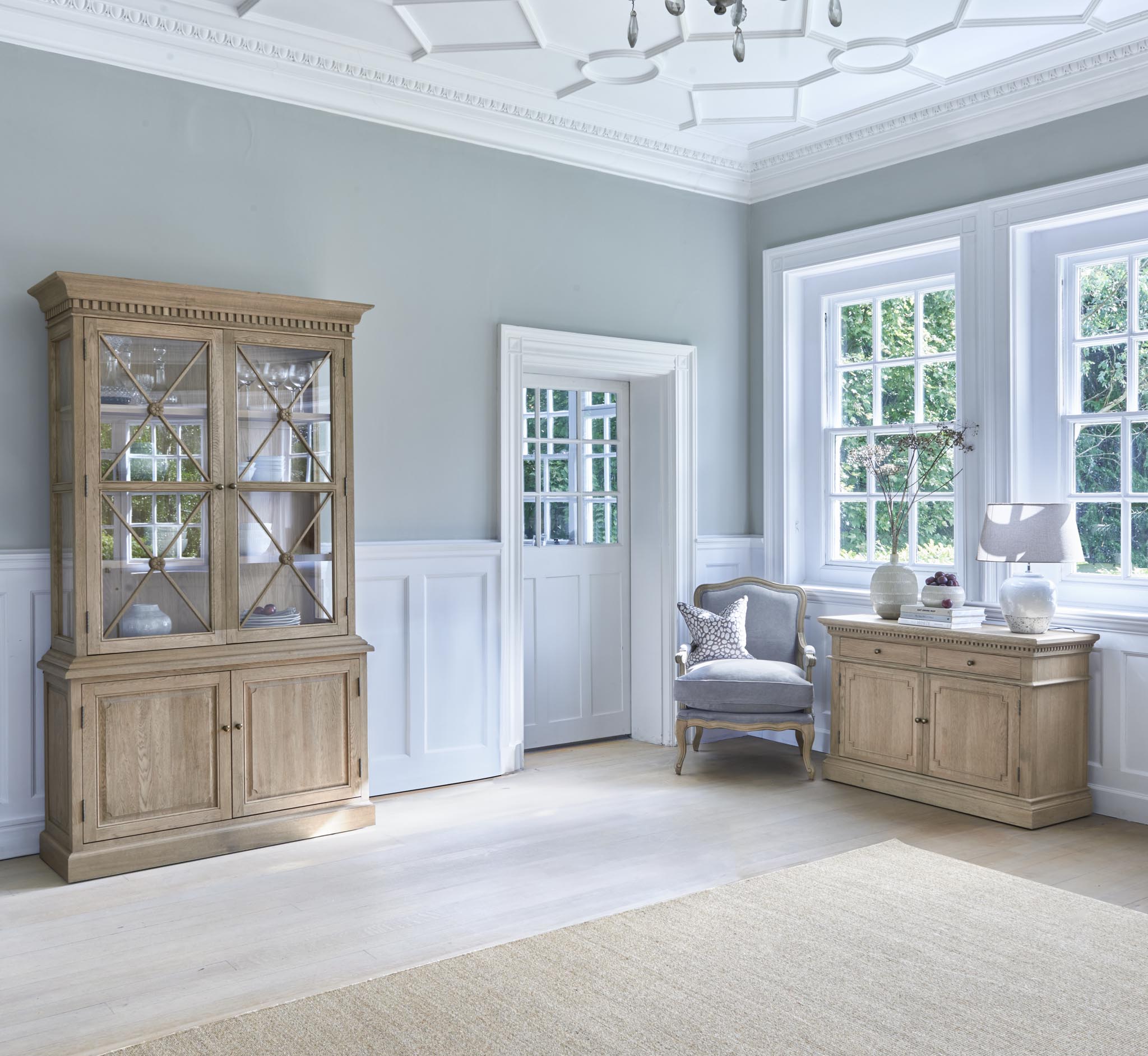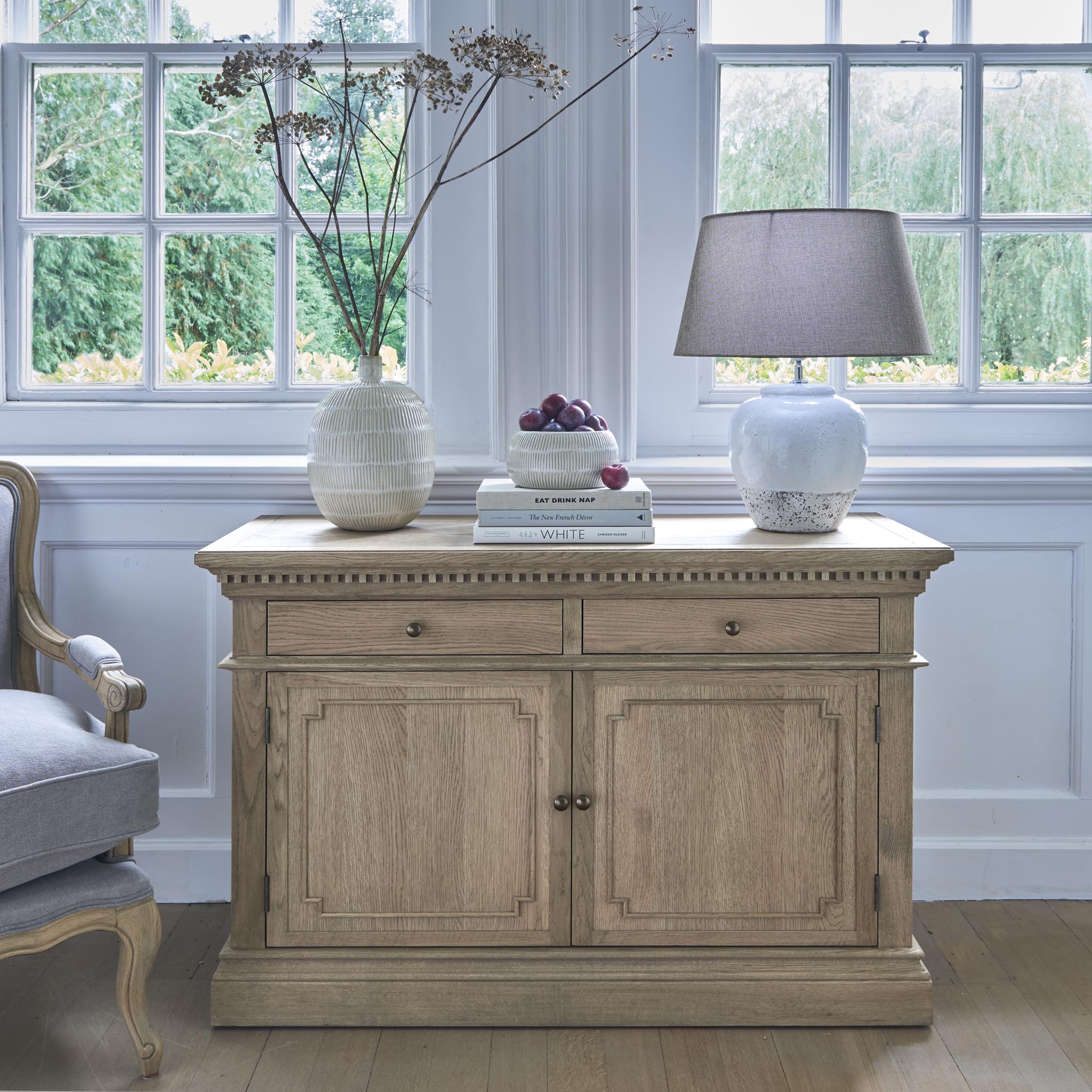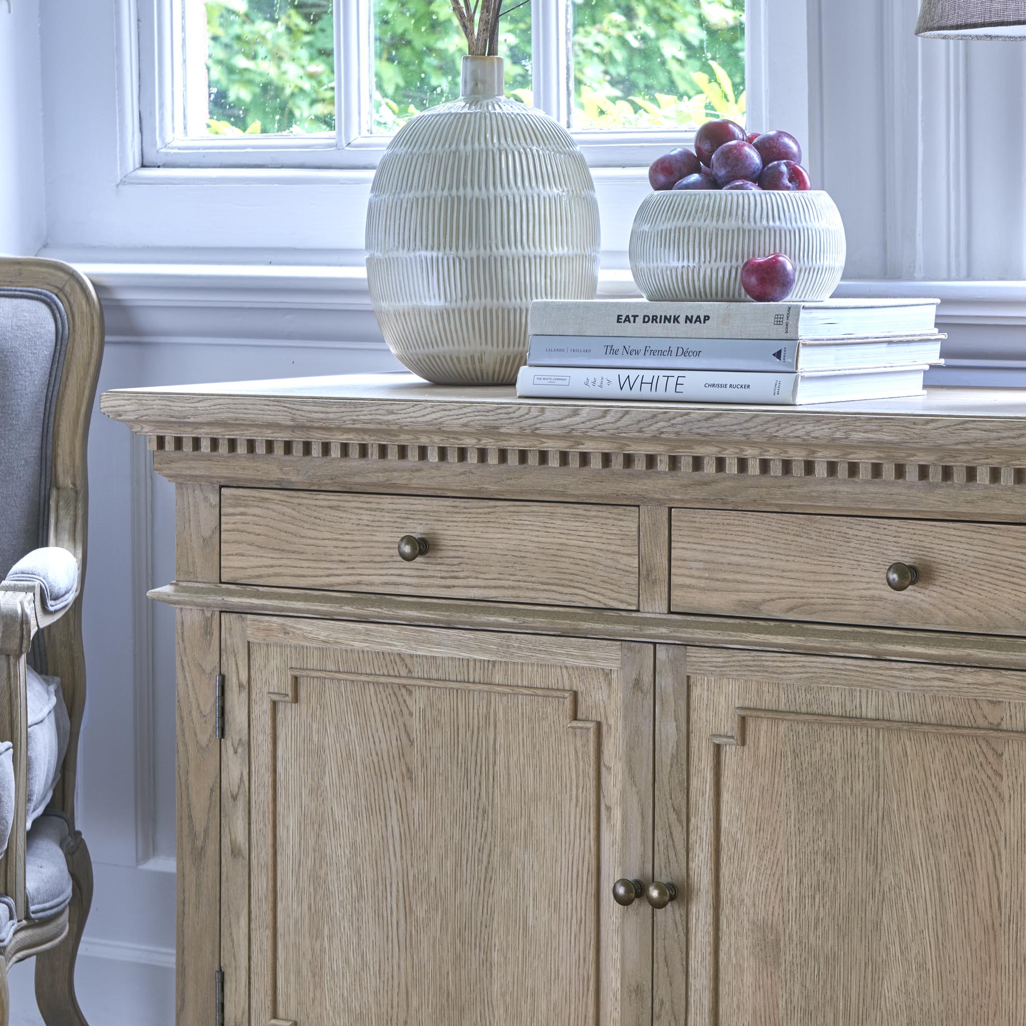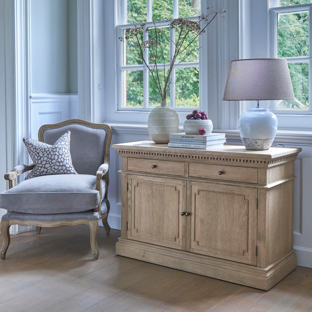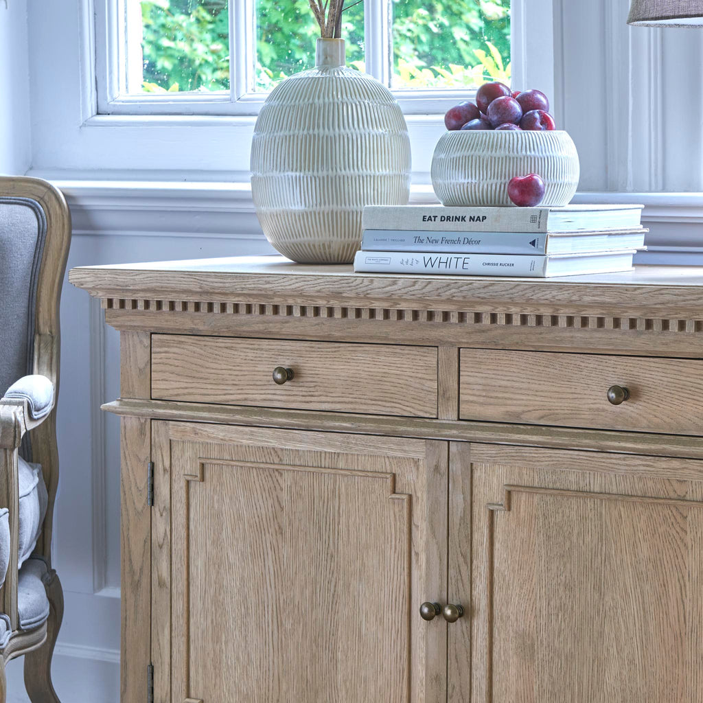 The Small Claremont Sideboard features two spacious cupboards and two drawers, providing elegant storage for everything from fine dinnerware to everyday dining essentials. Also available in a larger size, this piece allows you to curate a complete and cohesive look throughout your home. This piece has been lightly wire-brushed to enhance the grain of the wood to give it a more pronounced appearance and to highlight the unique texture of the oak. Hand crafted from solid oak and finished with our signature multi-staged weathered oak finish to enhance the wood’s natural warmth and character. Its classic design, finished with the collection’s signature dentil moulding detail, pairs beautifully with our Claremont Dresser and complements all our other exclusive furniture collections. The Small Claremont Sideboard combines timeless style with everyday practicality, making it a refined addition to any dining or living space.