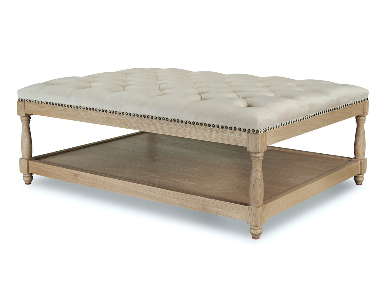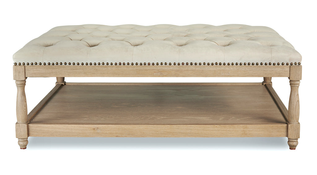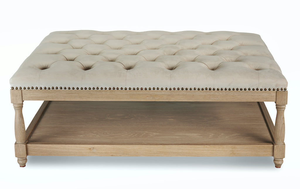 Upholstered in a luxurious oatmeal stain-resistant velvet, this stunning ottoman is handcrafted with a solid, sturdy, and weighty weathered oak frame. It has been lightly wire-brushed to enhance the grain of the wood, giving it a more pronounced appearance and highlighting the unique texture of the oak. This ottoman features a sumptuous deep-buttoned, hand-upholstered top with brass studded detailing around the edge, adding to the attention to detail. It can be used as a coffee table, footstool, or extra seating and it features a handy shelf underneath for extra storage. This piece will add a truly stylish look to any sitting room.